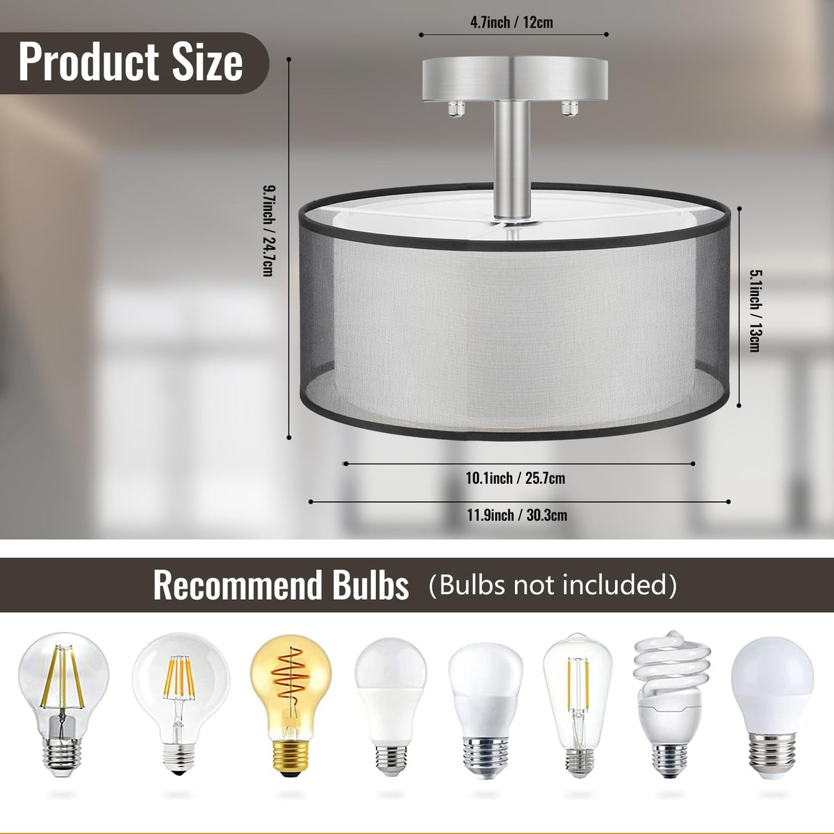 Q: What materials are used in the ceiling light fixture's construction?A: The ceiling light features a sturdy steel frame with a brushed nickel finish, complemented by a double fabric shade. This combination not only offers durability but also a stylish touch to your interior design.
