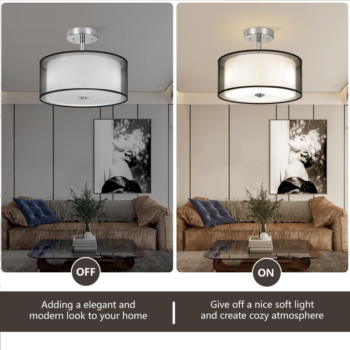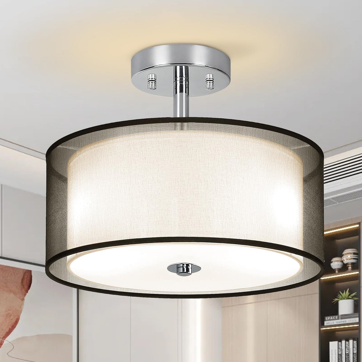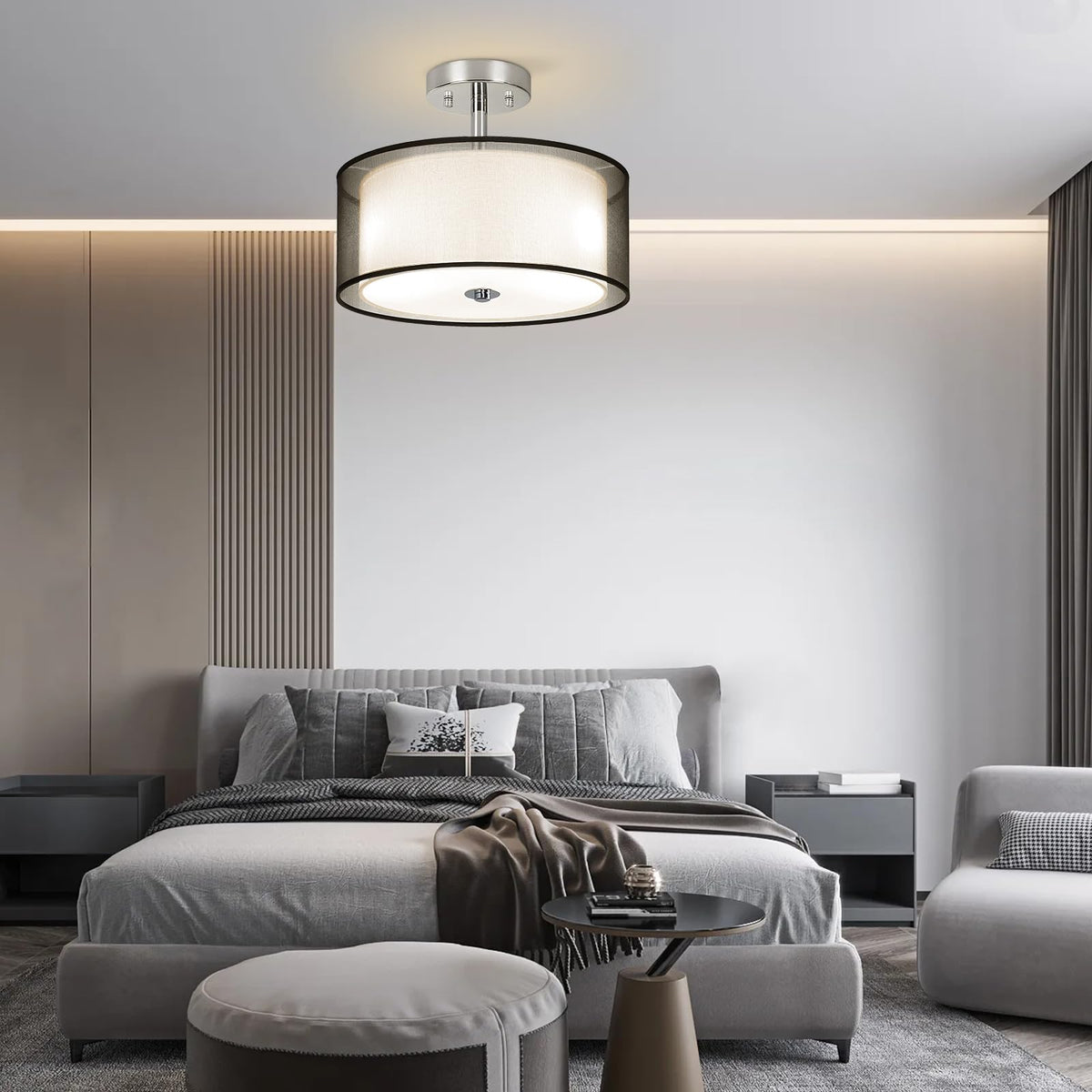 Semi Flush Mount Black 3-Light Ceiling Fixture For Bedrooms With Double Fabric Shade