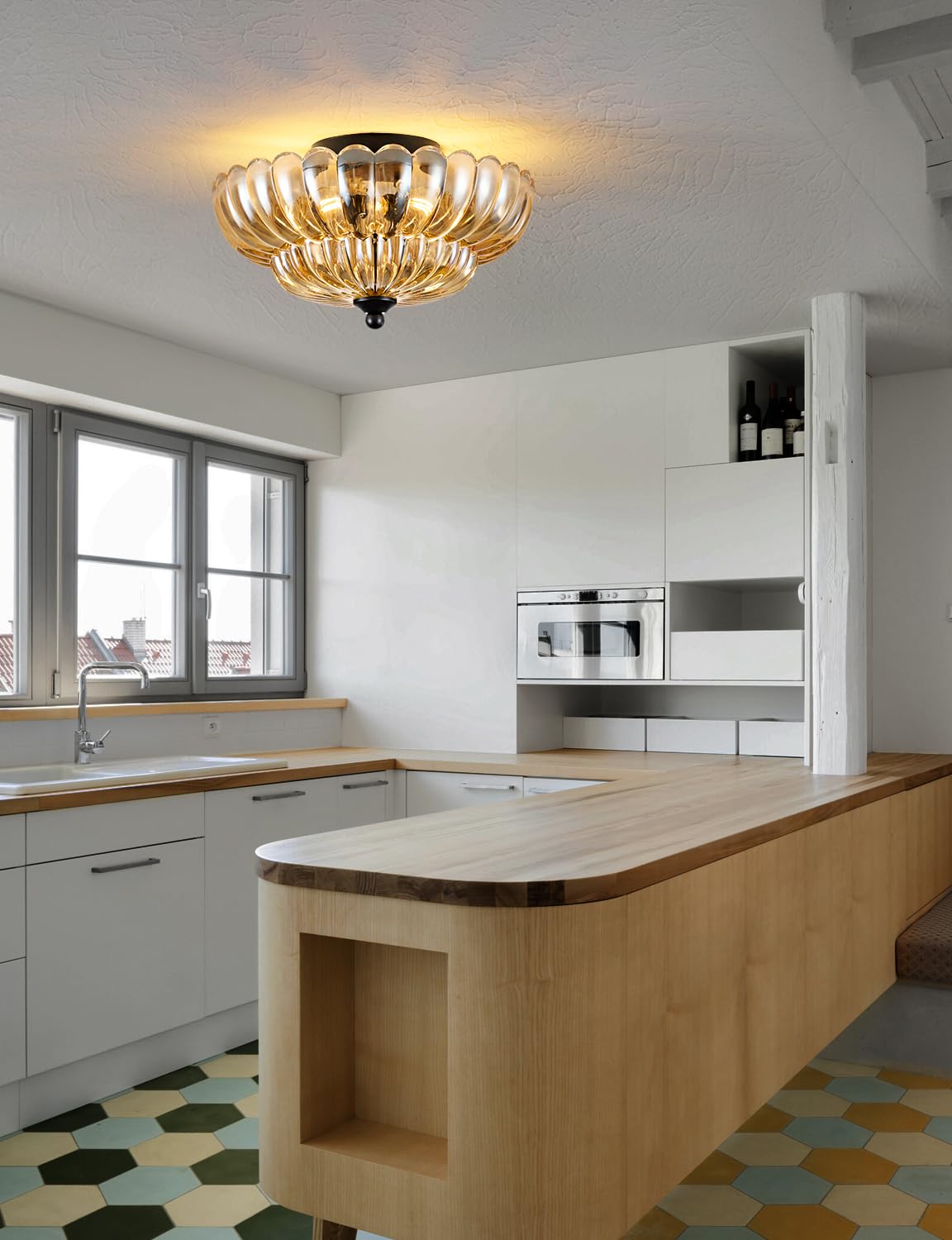 - Stunning Floral Glass Design: Transform your space with our exquisite ceiling light, featuring a breathtaking thick floral glass shade in clear, amber, and smoky gray finishes. When illuminated, this elegant fixture casts a beautiful light effect, making it the perfect decorative lighting solution for your bedroom, classroom, hallway, or any area that craves a touch of sophistication.