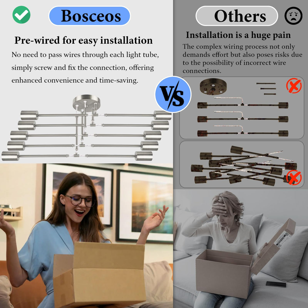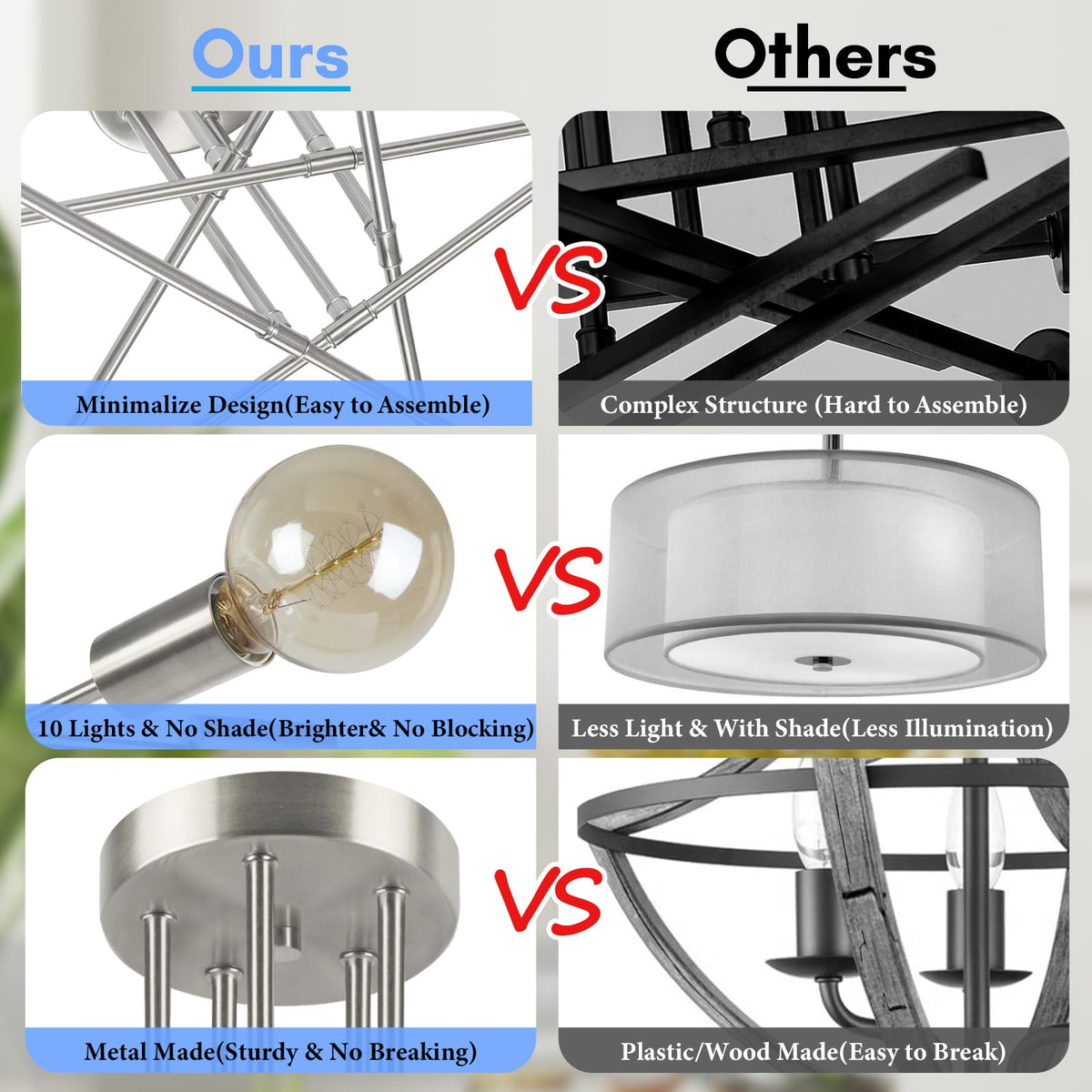 10 Lights Semi Flush Mount Ceiling Light Fixture Made Of Premium Metal Material And Brushed Nickel Painted Finish, Making The Light Fixture Solid And Durable. It'S Arranged By 10 Long And Short Linear Arms Crossed, Utilizes An Industrial Vintage Look And A Modern Style Design Creates An Elegant Artistic Lighting Atmosphere Brushed Nickel