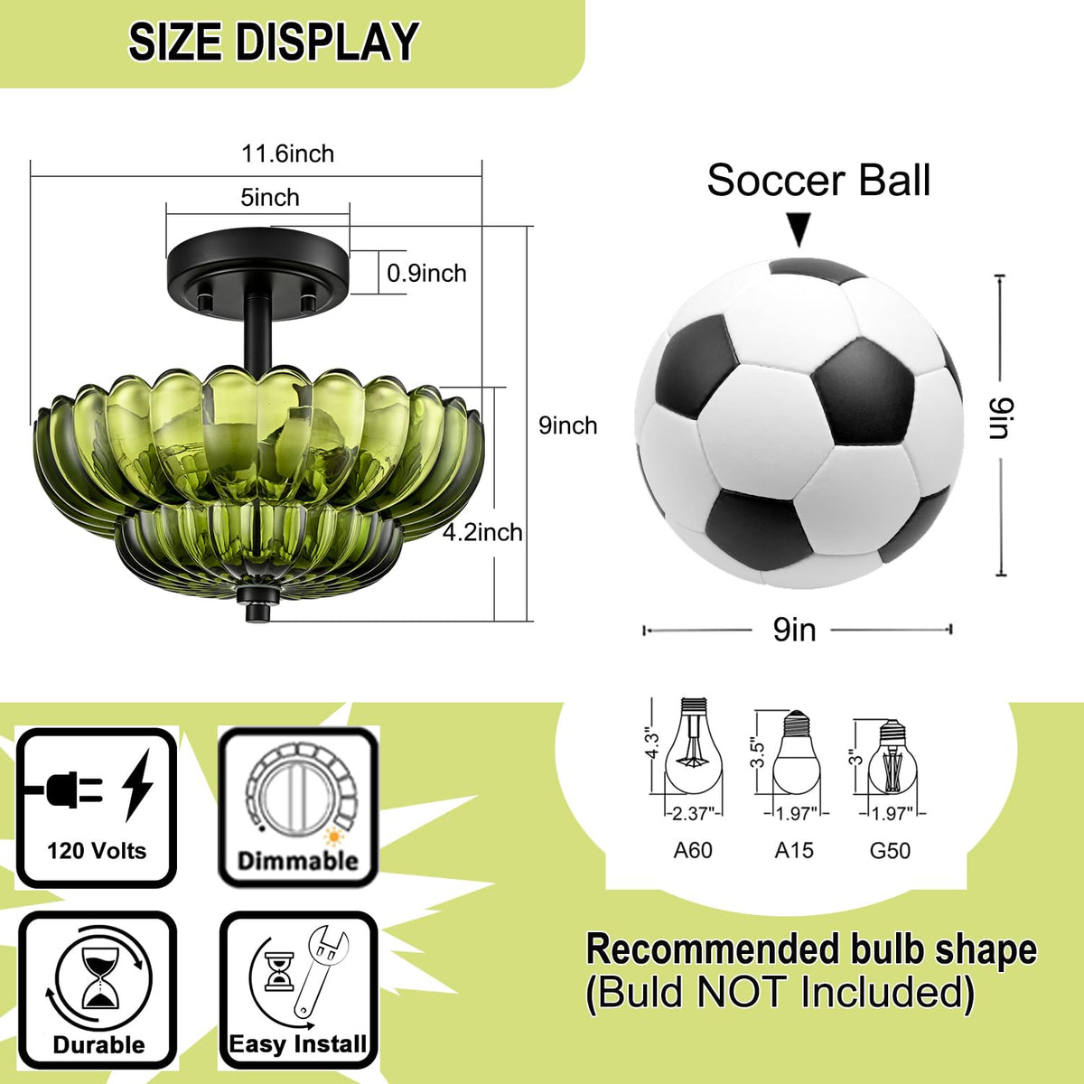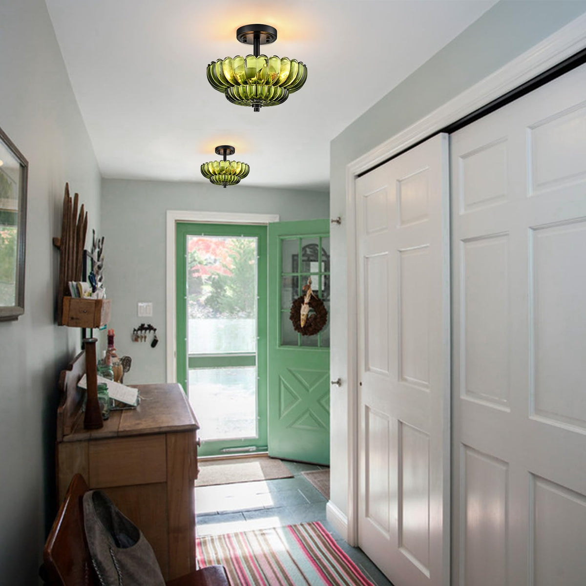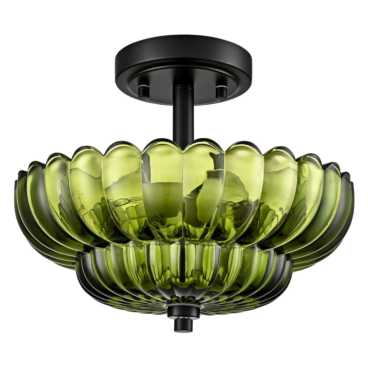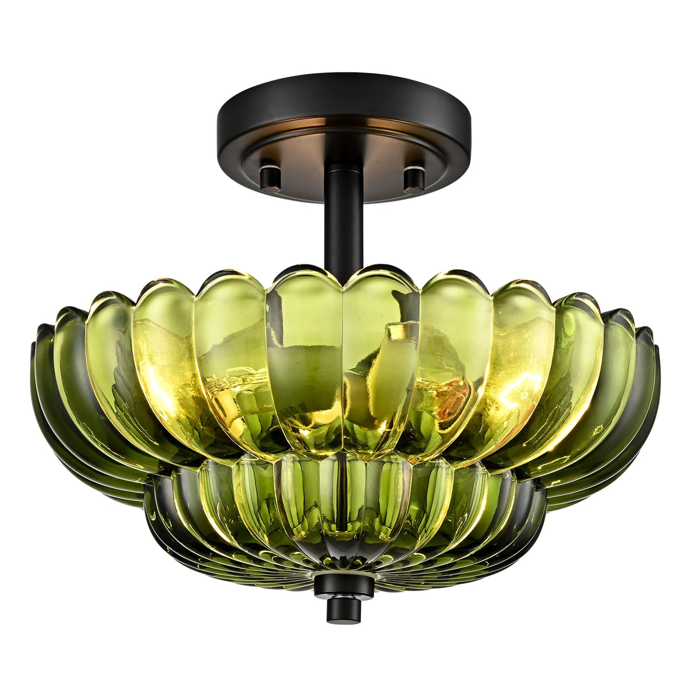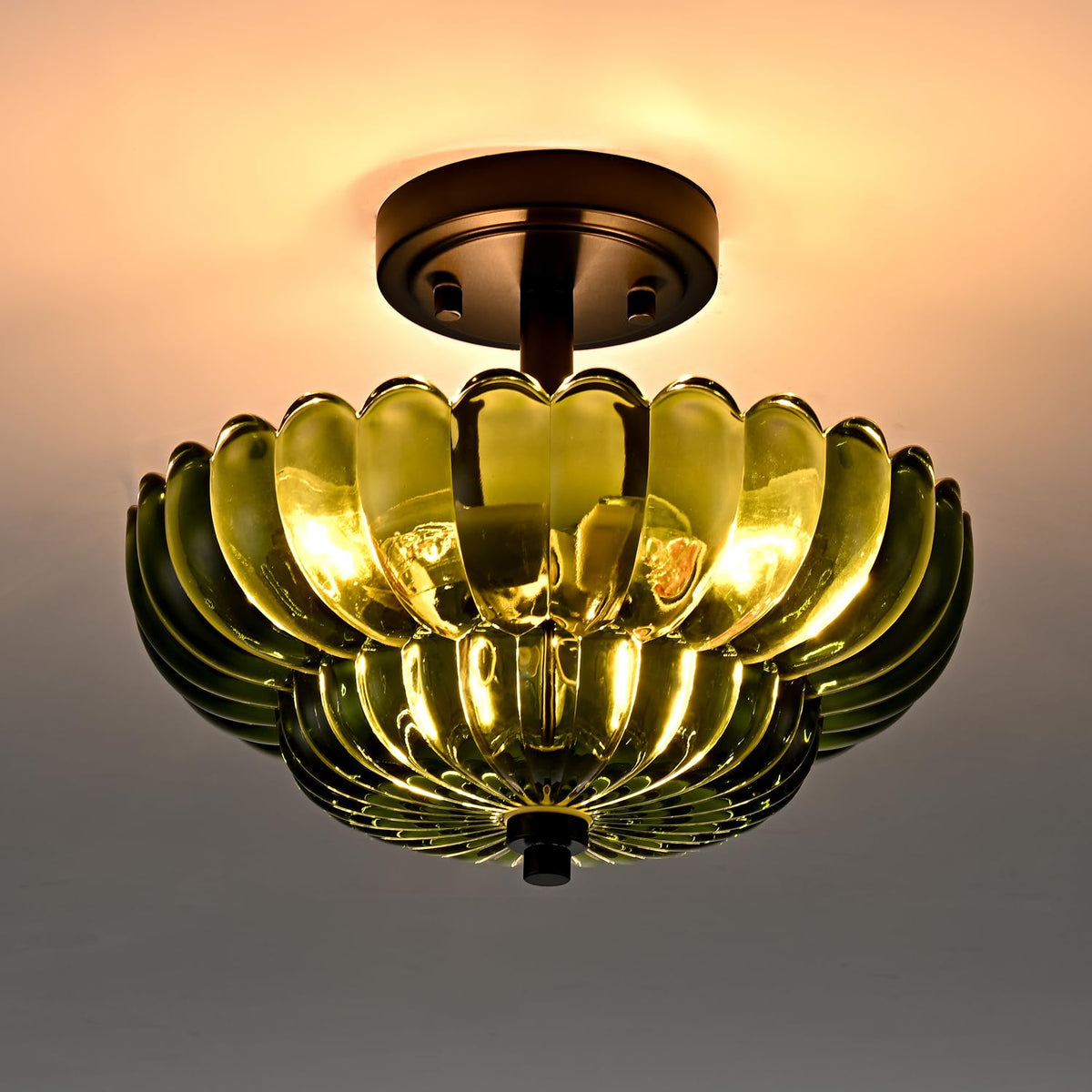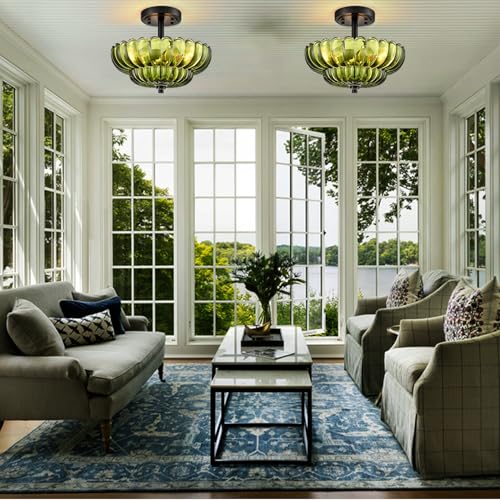 Scalloped Green Glass Semi Flush Mount Ceiling Light 3 Lights Modern Close To Ceiling Light Fixtures Vintage Ceiling Light Fixtures For Bedroom Living Room Entryway Hallway
