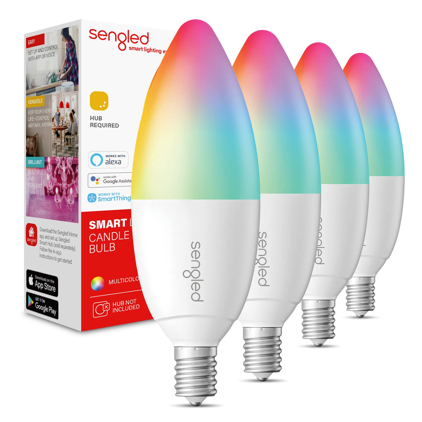 ?Zigbee Hub Required?Pair Sengled e12 smart bulbs to a compatible Zigbee hub, including Sengled Smart Hub(sold separately: B0828KXVGQ), SmartThings Hub, Wink and Habitat. Also compatible with built-in smart hub devices: Amazon Echo Plus, Echo 4th, Echo Show 10. Also Work with Apple Homekit & Siri if you have Sengled Hub (4th Gen). | ?Zigbee Smart Candelabra Bulb?Smart candelabra bulb can generate more than 16 million colors, including RGB & tunable white with high brightness (450lm) and excellent color rendering (CRI =90). The color temperature of Alexa light bulbs is changeable (2700K) and the brightness of every color is dimmable (1%~100%). The 5W smart light bulbs are equivalent to a 40W traditional incandescent bulb, saving about 87% energy. 25,000 lifetime hours (based on industry average usage), Energy Star Certified. | ?Smart Voice & APP Control?Pair the Sengled smart e12 led bulb with a compatible hub to activate complete voice control with Alexa and Google Assistant devices. Send a voice command to turn on/off or dim/brighten your bulbs. By Sengled Home APP, even adjust and set up exclusive colors to dress up your party, Halloween, or Christmas.?Don't use a wall dimmer to dim our Zigbee smart e12 led bulb? | ?Group & Remote Control?Via Zigbee protocol, even if WiFi is not available at home, it will not affect local control of the sub-devices. So don't worry about the limit of the network. Connect the smart chandelier light bulb to Sengled Hub which works with both 2.4Ghz & 5Ghz routers. Create a group for Sengled smart bulbs to control remotely wherever you are. Set timers and light schedules, automating your smart chandelier light bulb to make it seem like someone is home even when you are away. | ?Smart Home Ecological Chain? Sengled Zigbee hub supports up to 64 Sengled smart light bulbs and accessories online at the same time (even outdoor). Zigbee Smart home ecological chains are more stable and safer than using a wifi system. Long-distance Signal Transmission and Worry-free that the Zigbee Smart Bulb signal quality is affected by the wall. Support 3-years free warranty, please contact us in time when you encounter product problems.