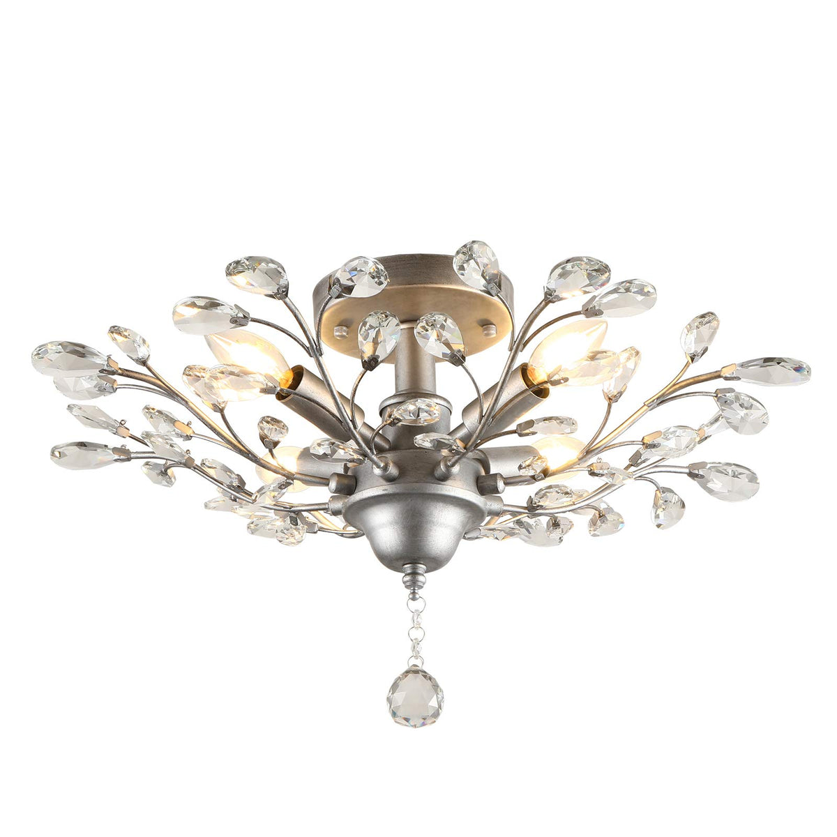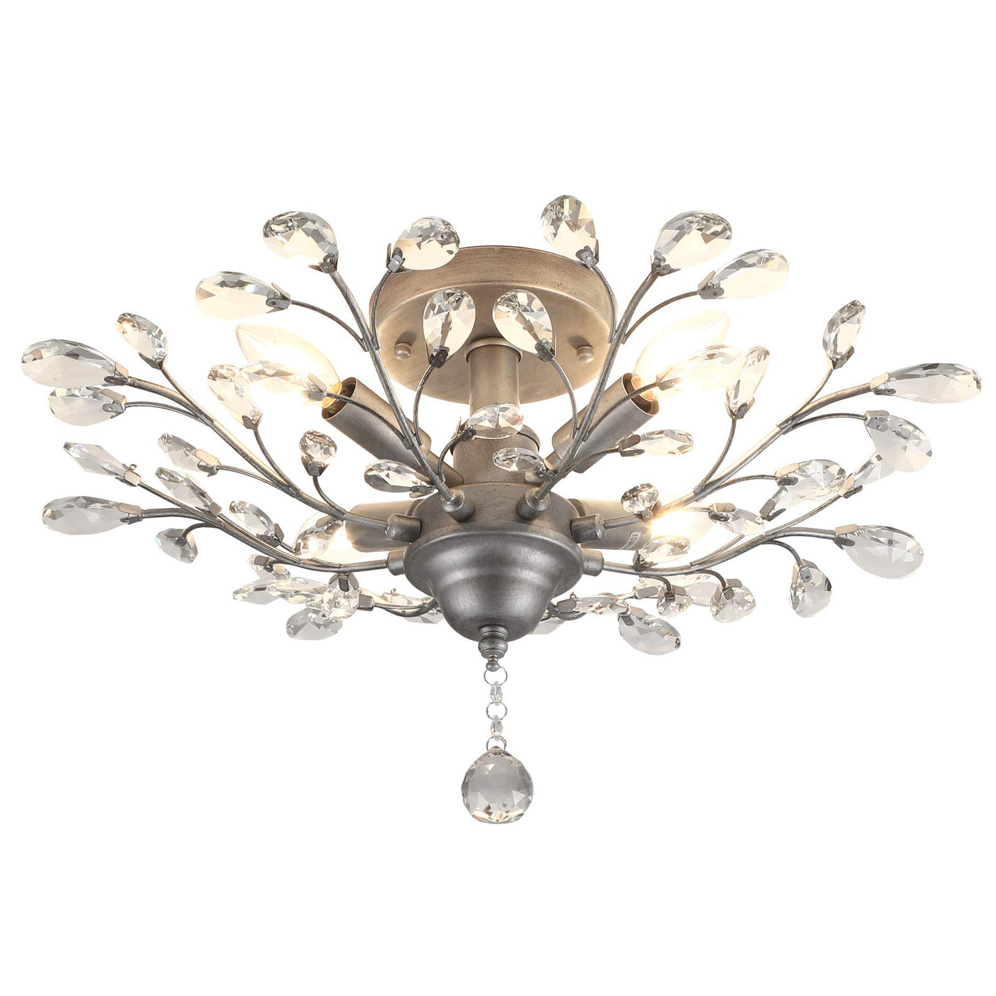 This ceiling light features a beautifully crafted metal body with a hand-discomfort-reducingted pewter finish and is adorned with sparkling faceted crystals. When illuminated, it creates a warm and inviting atmosphere, diffusing light through its intricately designed crystal branches. The fixture is easy to install with all necessary wires connected and includes comprehensive installation instructions.