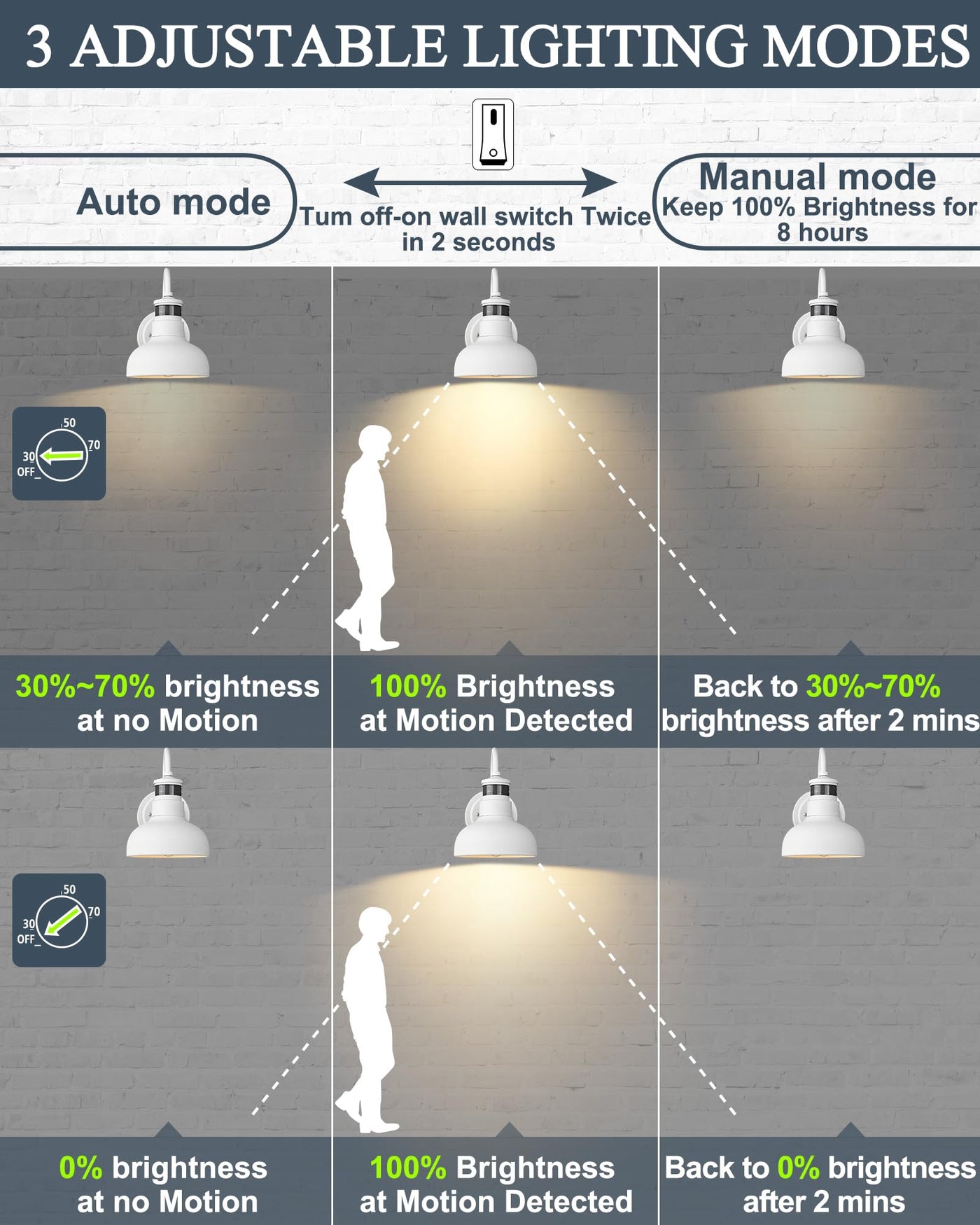 Upgrade your outdoor lighting with our versatile wall lights, featuring 3 Adjustable Lighting Modes for customized brightness: Dim at 30%-70% brightness at night, brightening to 100% upon motion detection. Fully off at night, activating at 100% brightness when motion is detected. Constantly on at 100% brightness throughout the night.