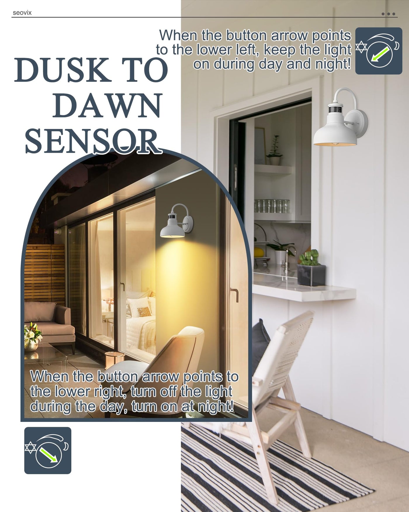 Q: What are the different lighting modes available for the Seovix Motion Sensor Outdoor Light?A: The Seovix Motion Sensor Outdoor Light features three adjustable lighting modes: 1) Dim mode at 30%-70% brightness at night, which increases to 100% brightness upon motion detection; 2) Off mode at night, activating to 100% brightness when motion is detected; and 3) Constantly on mode at 100% brightness throughout the night.