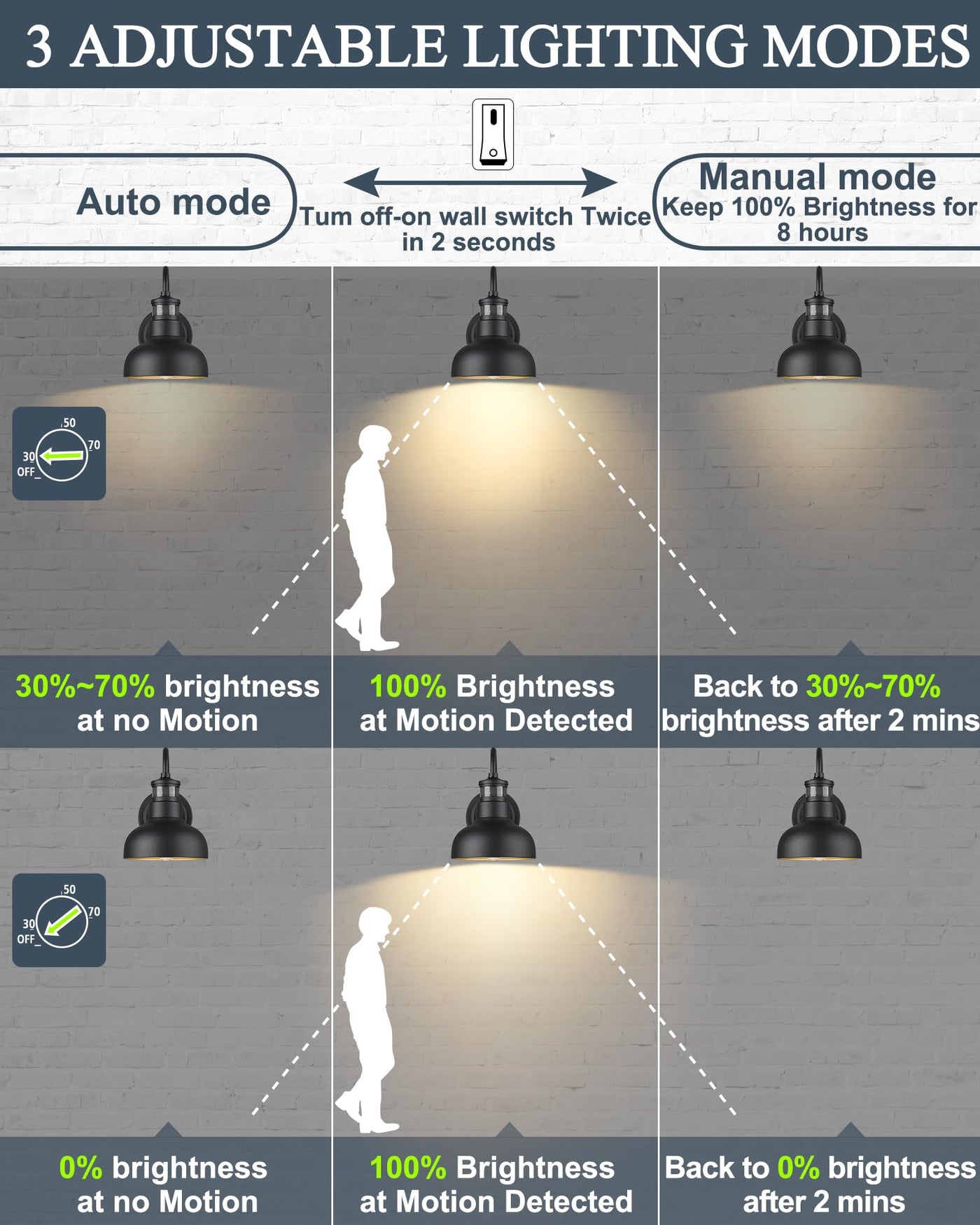 Q: What are the different lighting modes available for the Seovix Motion Sensor Barn Lights?A: The Seovix Motion Sensor Barn Lights feature three adjustable lighting modes: 1) Dim mode where the light stays at 30%-70% brightness at night and brightens to 100% upon motion detection; 2) Off mode where the light remains off at night and activates to 100% brightness when motion is detected; 3) Constant mode where the light stays on at 100% brightness throughout the night.