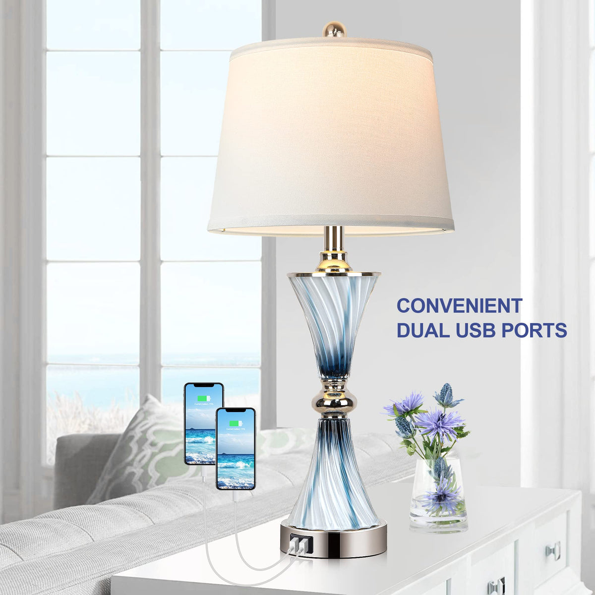 Set Of 2 Blue Glass Table Lamps For Bedrooms With 2 Usb Ports 3-Way Dimmable Touch Coastal Bedside Lamps For Contemporary Style