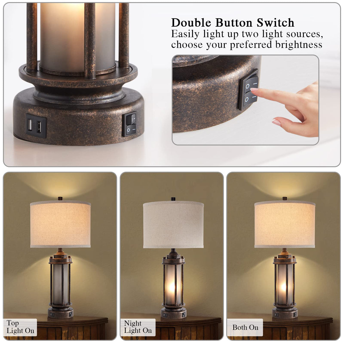 This Farmhouse Table Lamp Features A Unique Design That Emphasizes The Classic And Rustic Feel Of An Oil Lamp, Making It The Great Complement To Any Room With A Vintage, Industrial, Or Rural Theme. The Top Light Is Covered With A Linen Lampshade That Provides Soft And Warm Lighting, While The Bottom Lantern-Style Glass Table Lamp Adds A Touch Of Charm To Any Room And Serves As An Excellent Home Decor Accent. Aieampdo Table Lamps To Meet Your Needs! Comes With A Two-Button Switch And Two Usb Charging Ports For Easy Control Of Lights And Charging Devices. It Also Comes With 4 Bulbs, A19/5W-2700K Small Bulb And C7/7W Small Bulb, Creating A Comfortable Shopping Experience Without Having To Purchase Compatible Bulbs. Dual Button Switch Operationour Vintage Lantern Table Lamp Is Designed With A Focus On The Classic And Rustic Feel Of An Oil Lamp, Making It The Great Addition To Any Room With A Vintage, Industrial Or Rustic Theme. This Lamp Comes With Two Light Sources, Both Of Which Can Be Lit By Two On/Off Buttons On The Lamp. You Can Click The Button To Turn On The Top Light Or The Bottom Light, Or You Can Choose Between Both On Or Both Off. This Table Lamp Is Great For Use On Bedside Tables, End Tables, Or Desks At An Entrance, Adding A Touch Of Charm To Any Space. Our Vintage Lantern Table Lamp Is Multifunctional And Easy To Operate, Making It A Stylish And Functional Lighting Solution For Any Room. Installation Is Extremely Simpleour Table Lamp Comes With A User-Friendly Installation Manual, Making It Incredibly Convenient For Users To Use. You Don'T Need Any Special Tools, Complex Equipment, Or Technical Expertise To Install And Use This Table Lamp. The Installation Instructions Are Clear And Straightforward, Allowing You To Quickly Enjoy The Comfortable And Warm Glow Brought By Your New Table Lamp.
