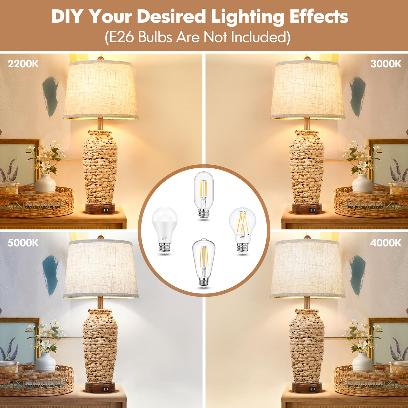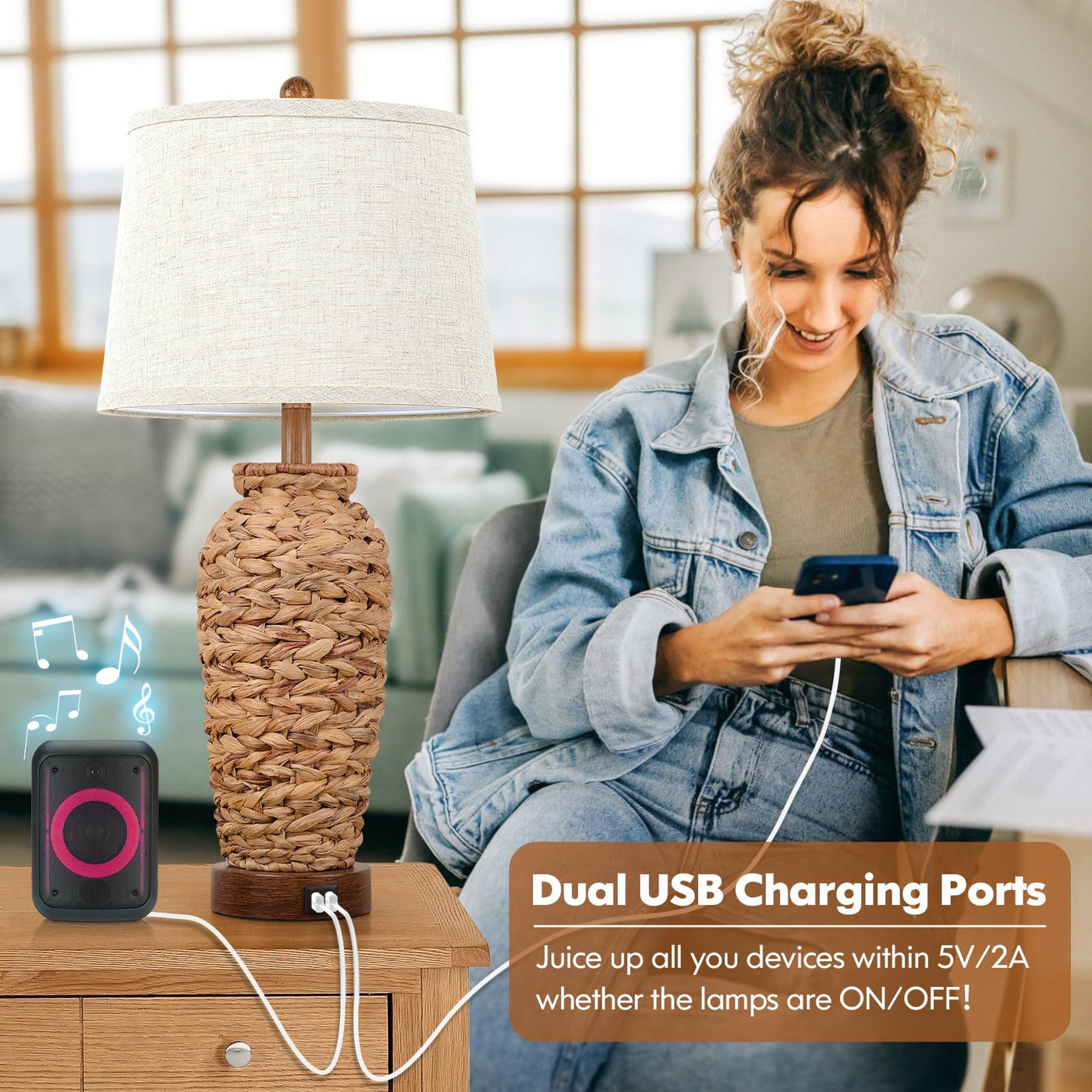 Set of 2 Costal Woven Seagrass Table Lamps with 2 USB Ports for Your Living Room BedroomWHY You Should Choose Us?Costal Rattan Lamps&Unique HandicraftOur living room table lamps are delicately constructed with seagrass rolling up through the base. Every twisting of the woven base are handmade by experienced workers, more than set of 2 farmhouse table lamps, but also unique artworks. Theyll be excellent eye-catching additions to bring out your home office where they stand. Practical Fast Charging Lamps with 2 USB Ports: Are you troubled in finding power banks or wall plugs for charging at midnight? Each of our 27 Inch tall lamps come with dual 5V/2A USB ports hence 4 facilities can be fast charged at the same time. Excellent designs for smart&simple life! The USB ports keep working no matter the lamps are on or off so no worry to disturb your lovers. Fantastic charging lamps for bedroom nightstands living room end tables or office. Easy-control ON/OFF Switch&Eye-caring Linen ShadesOur set of 2 rustic table lamps are controlled by simple rotary switch, just turn clockwise to light on/off the lamps within reach. Paired with a thick fabric shade, our woven table lamps filtering the lighting so well and give out gentle smooth lighting, no harm for eyesight, safe lamps for kid/elder Easy Installation 1-Roll up the shades along with the rings;2-Screw the E26 socket; 3-Install the harp;4-Screw the finial;5-Insert E26 base bulbs(NOT INCLUDED)Warm Tips:This products is NOT waterproof and indoor use only.E26 Bulbs(60watt Max) Are Not Included. You may choose bulbs with different lighting effects(2200K/2700K/3000K/4000K/5000K) to fit in various occasions such as dining reading working sleeping 12-month quality assured for this tall lamps, do feel free to contact if any issue occurs