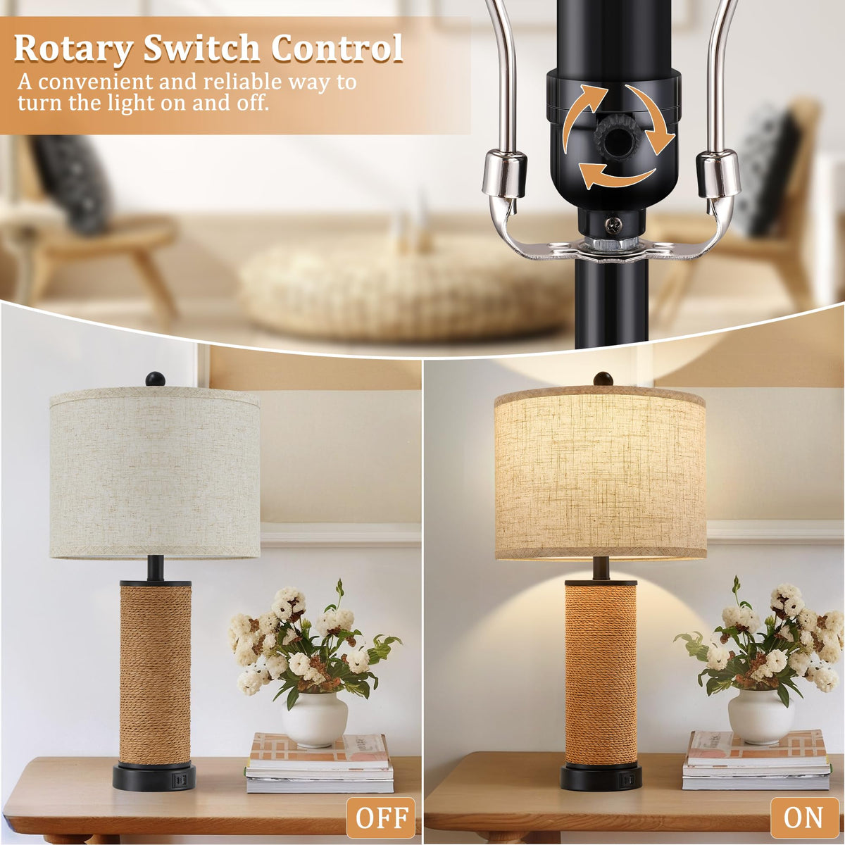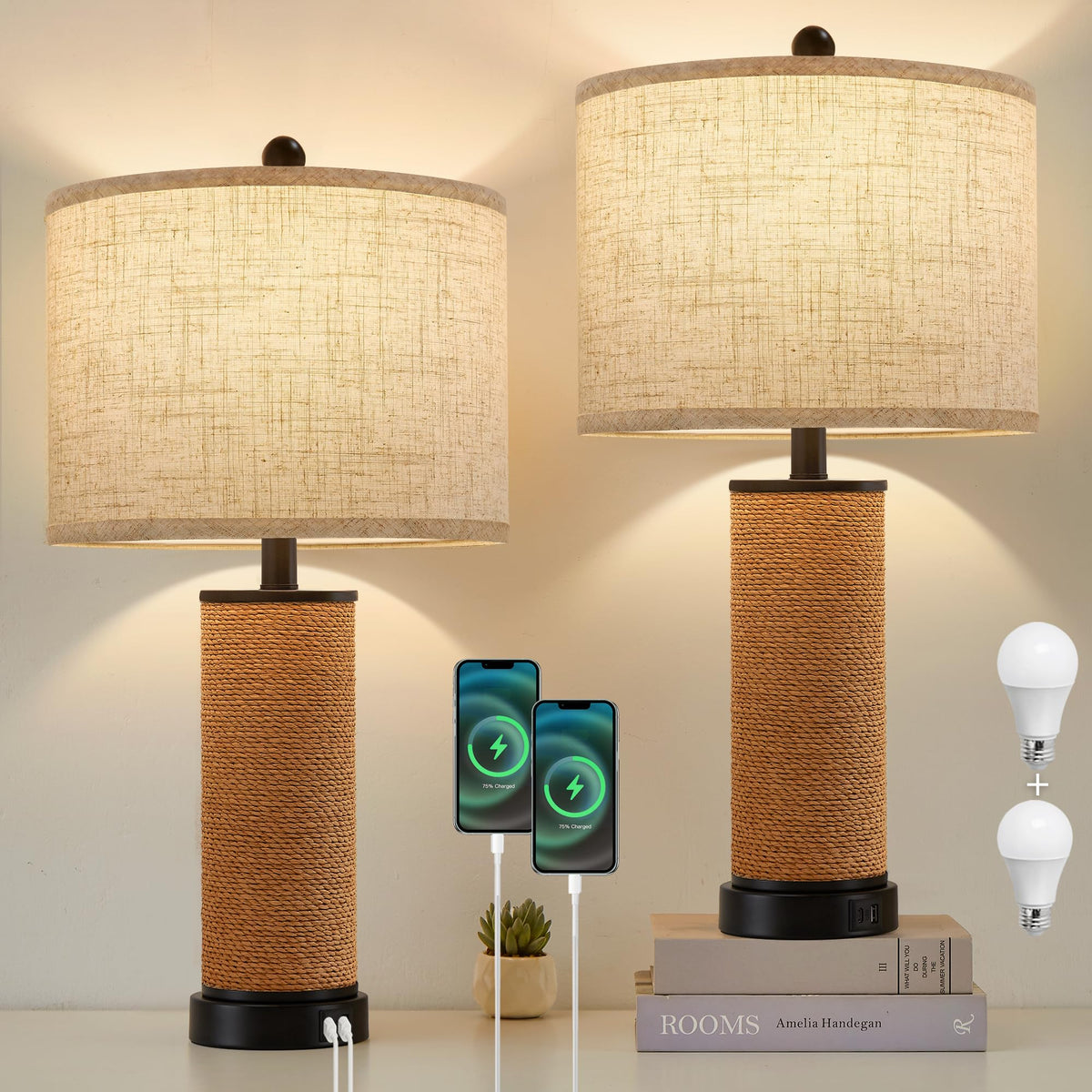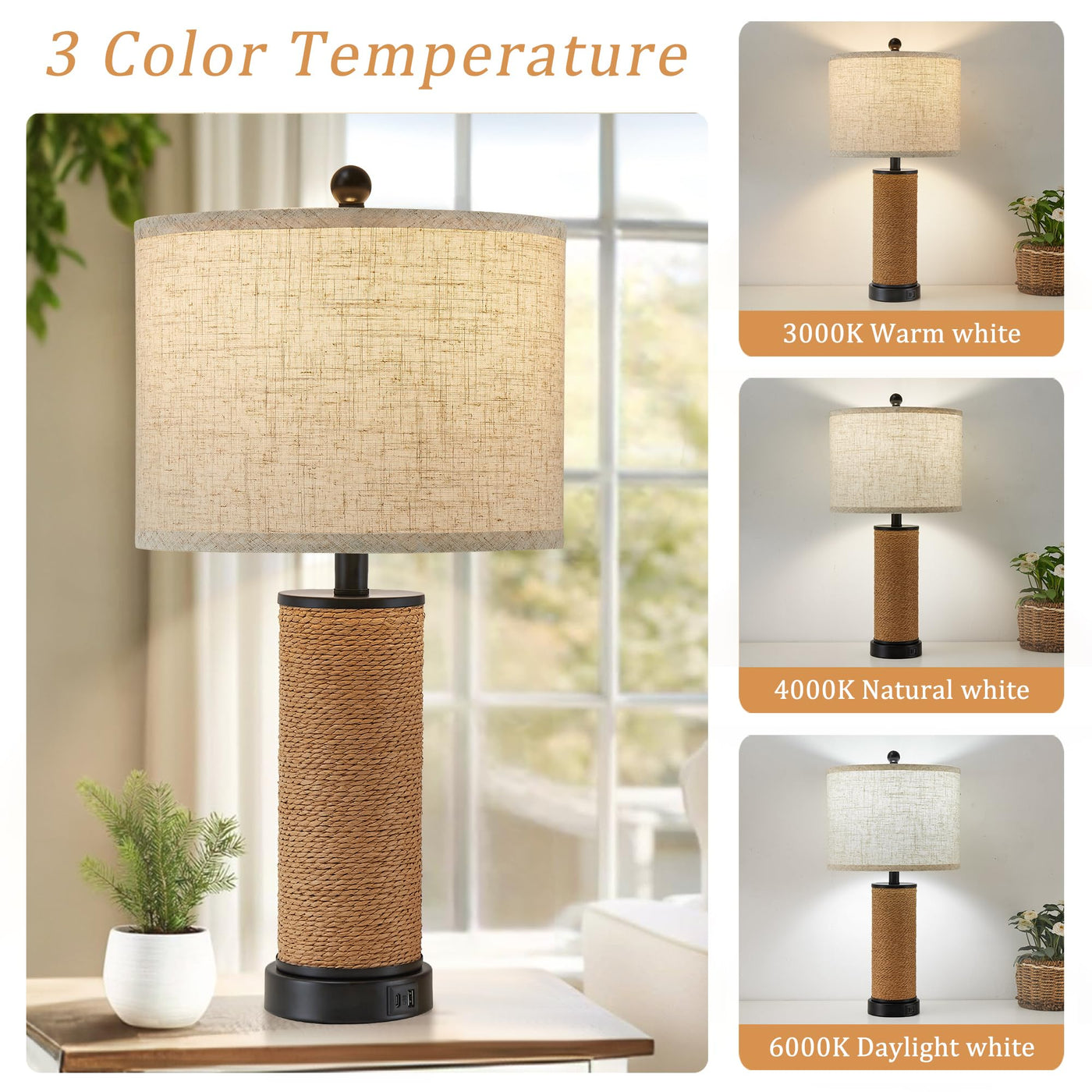Set Of 2 Rattan Table Lamps For Living Room With Usb C+A Ports, 3 Color Temperature Nightstand Bedside Lamp Rocker Switch Coasta