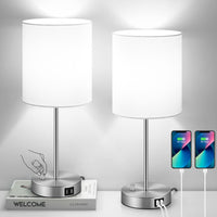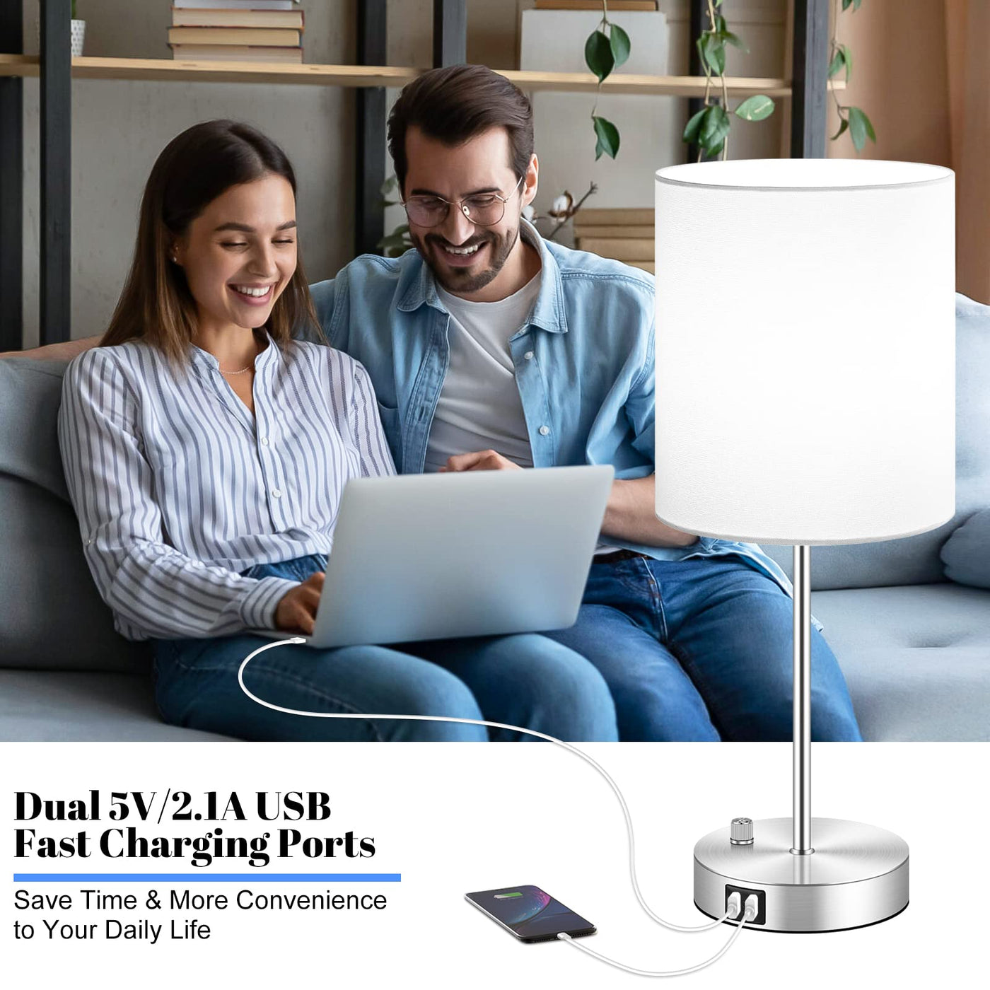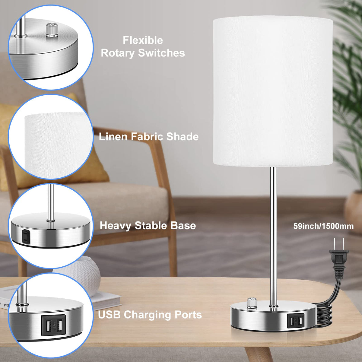 Set Of 2 Table Lamps With Usb Ports, White Bedside Lamps With Ac Outlet, Modern Nightstand Lamps With Rotary Switch, Minimalist