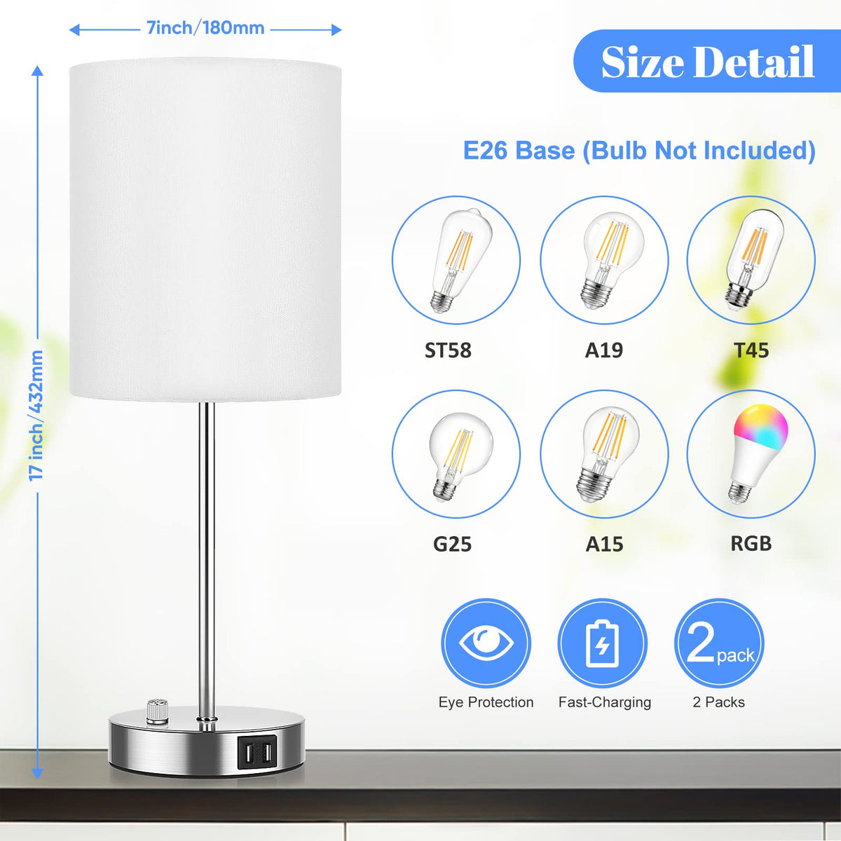Q: What type of light bulbs are compatible with these table lamps?A: These lamps come with a standard E26 bulb socket, allowing you to use any E26 base light bulbs of your choice, including smart bulbs. This gives you the flexibility to create the desired atmosphere with different shapes and colors of bulbs.