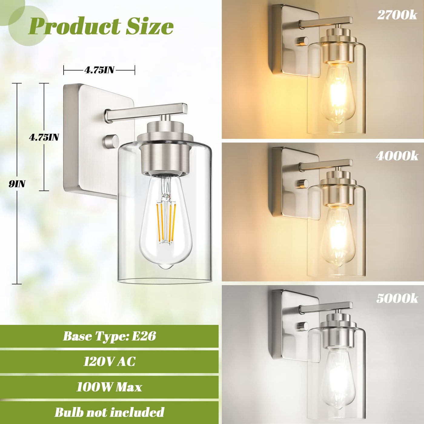 Durable Material& Stylish Design: The modern wall lights set of two are well-made with a durable brushed nickle finish so that this silver wall light fixtures are waterproof, anti-rust and corrosion, don? worry about color fading, equipped with a clear glass lampshade, allowing your bulb to emit bright lighting to create a wonderful atmosphere for your place | Recommended E26 Bulbs: Our brushed nickel sconces wall lighting fit any bulb with a standard E26 socket (bulb not included), different types of bulbs will make set of 2 wall sconces take various ambience, 2700K warm white bulbs brings you relaxing and welcoming feeling, however 5000K daylight white bulb give you clean and energetic enjoyment (Max. 100W, works on 120V) | Super Wide Application: designed with a brushed nickel finish and a cylinder glass shape, these bathroom light fixtures are suitable for home indoor, it can be also used as a reading lamp, vanity light, bathroom mirror light, bedroom wall light fixtures. Meanwhile, this wall-mounted lantern fixture can be widely used in the garden, porch, balcony, doorway, hallway, courtyard, and other exterior areas of a coffee shop, restaurant. When used outdoors, it is recommended to use under eaves | Up and Down Reversible Mounting: The brushed nickle vanity lighting fixtures are generally installed on the top of the head when as mirror lights or porch lamps, which can be installed downward for lighting; If you need to use a lamp when reading or doing other things sitting on a bed or stool, you can install it up in a lower place. Besides you can install the wall light up or down according to your preferences to achieve the lighting effect you want | Easy & Quick Installation: It only takes three steps to install our set of 2 wall lanterns within few minutes. And easy operation with an open bottom allow it handy operation for bulb replacement. Necessary attachments required for installation are included in the package. If there is something unclear during your assembling process, you can check the manual