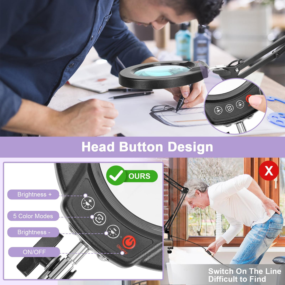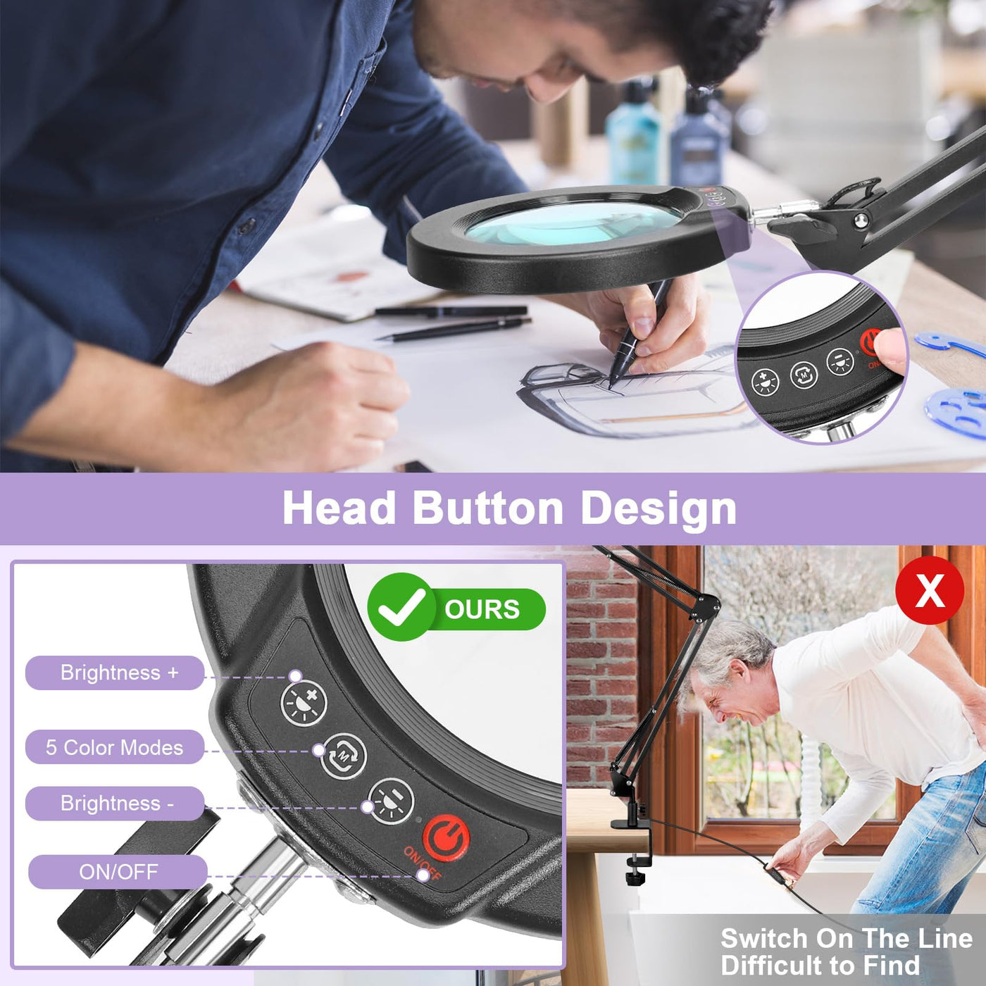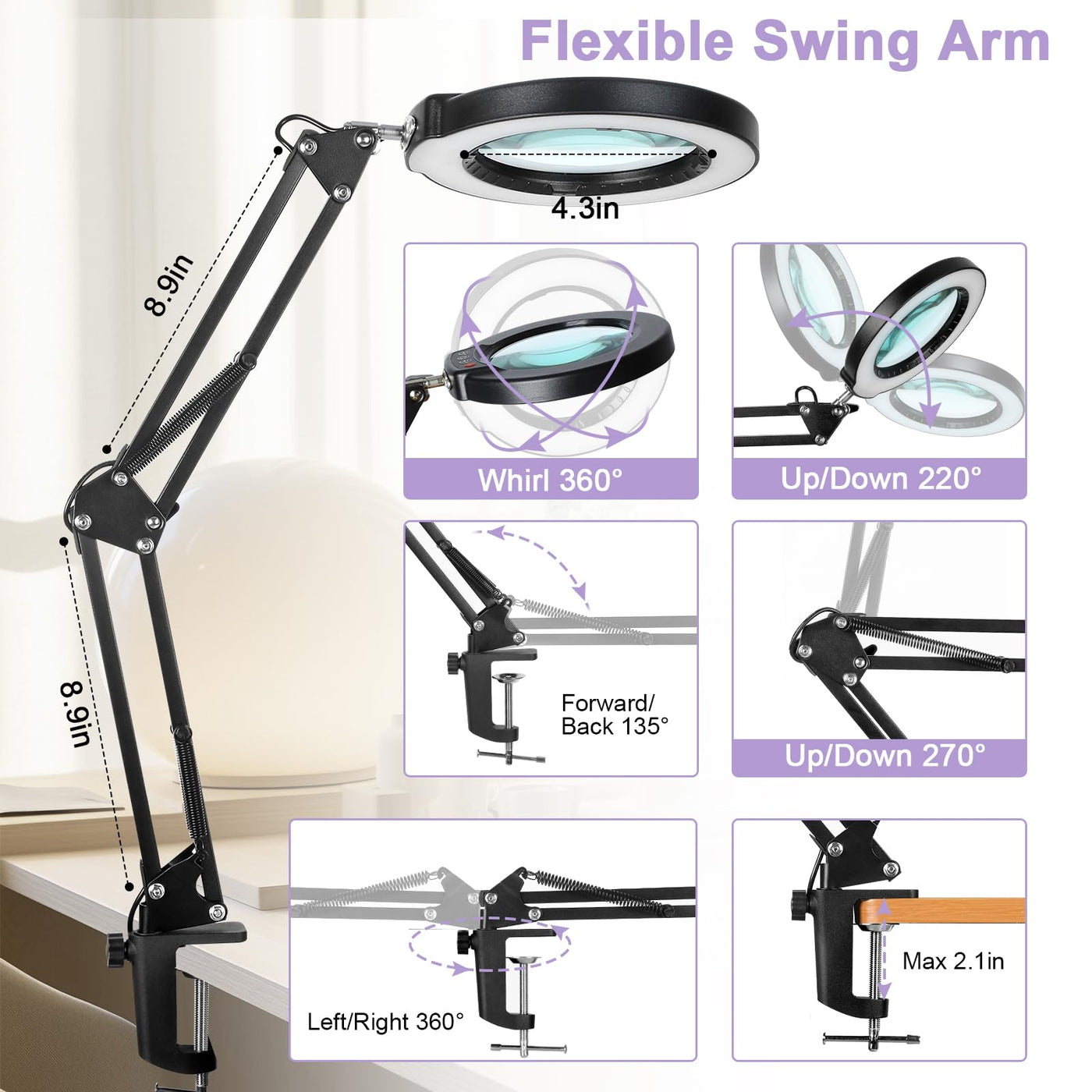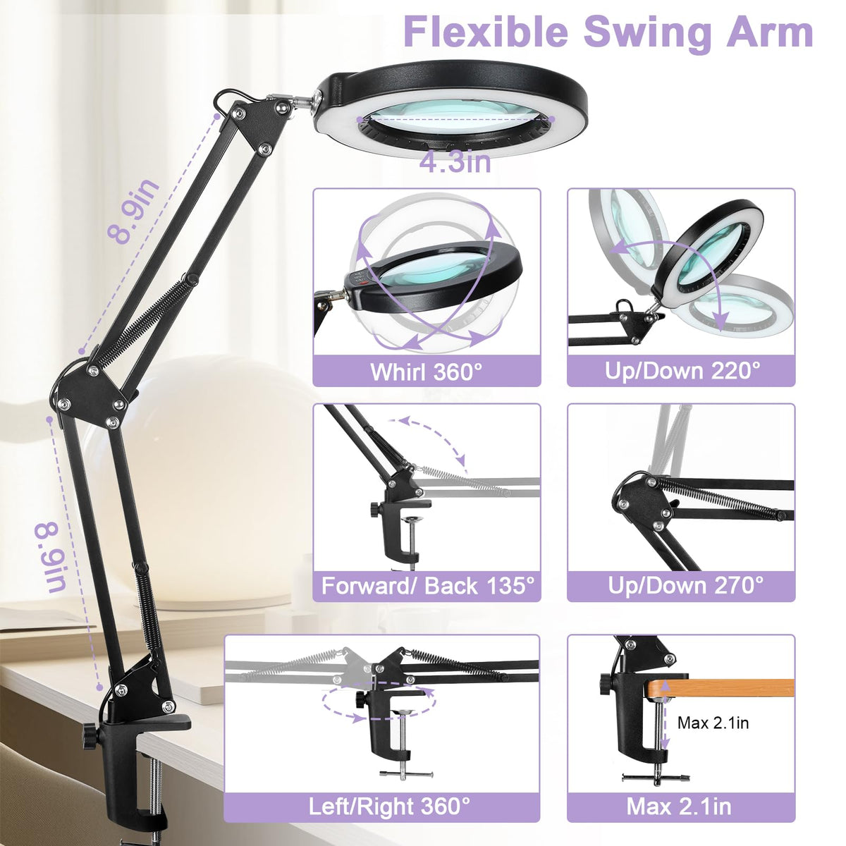 - Q: How does the adjustable color temperature work on this magnifying lamp? A: The Seylae magnifying lamp offers 5 adjustable color modes, allowing you to customize the lighting to suit different tasks and preferences, making it ideal for various activities like reading, crafting, or makeup application.