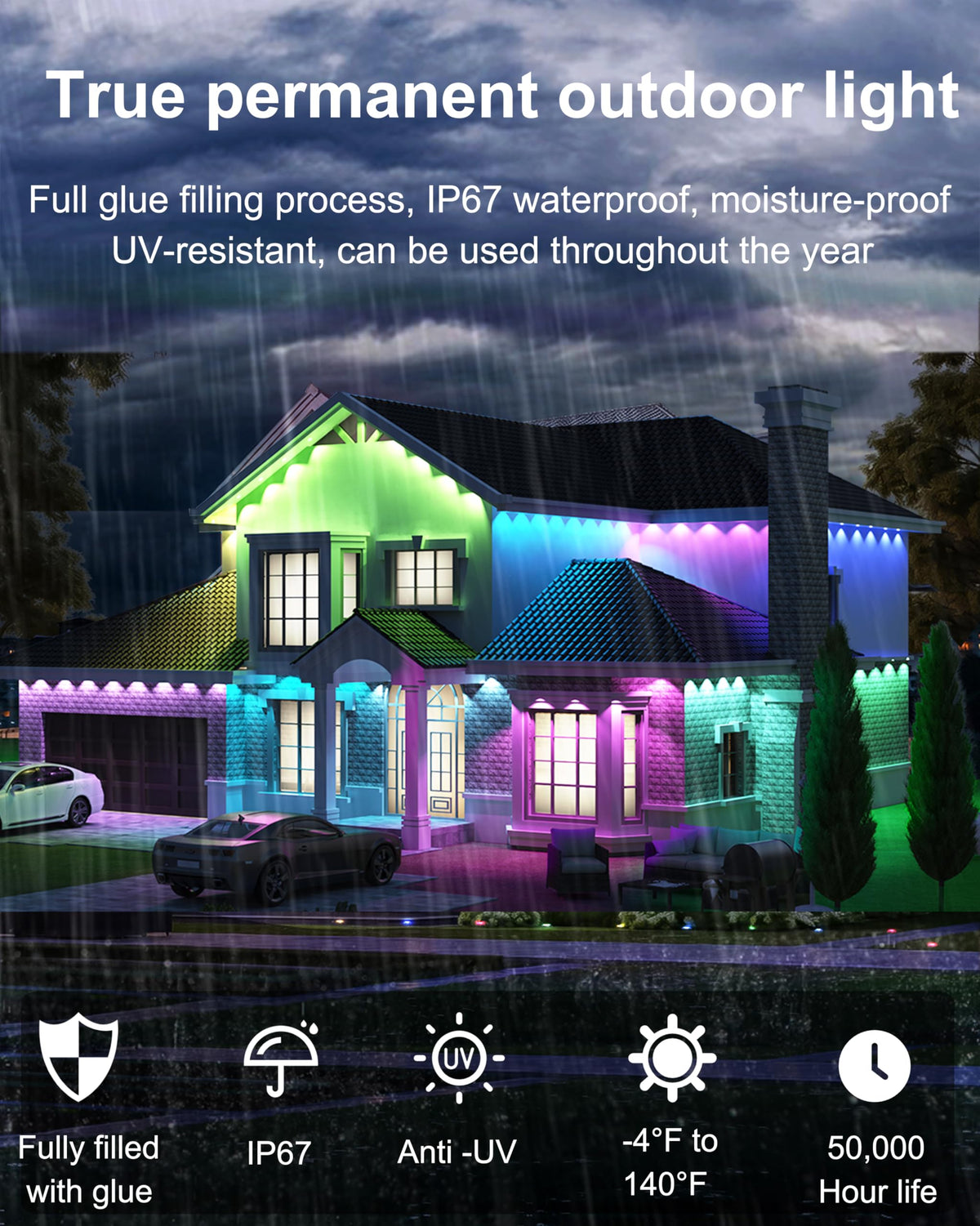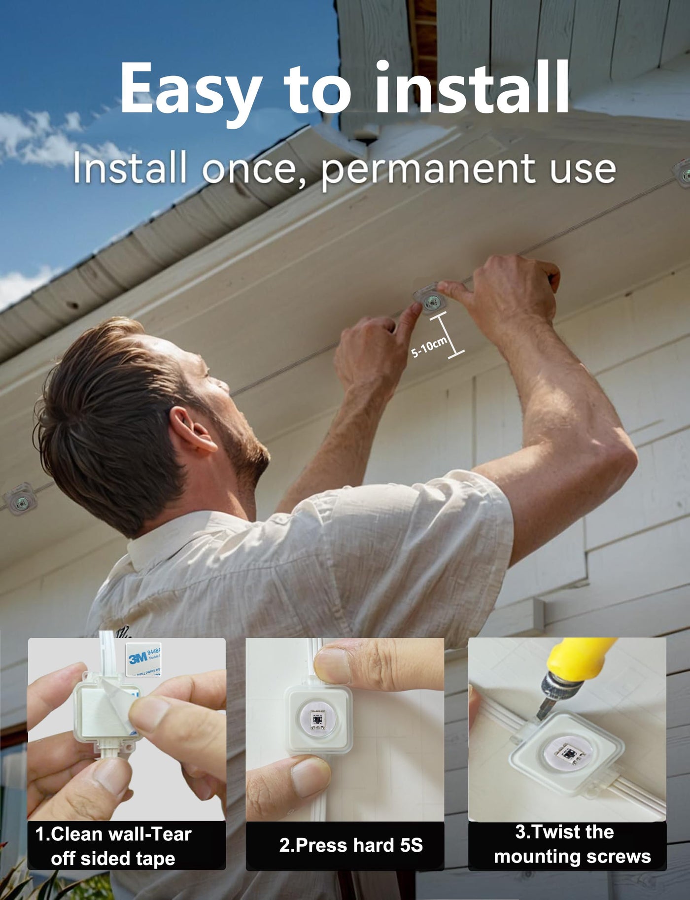 Transform Your HomeS Exterior With These Smart Permanent Outdoor Lights Spanning 100 Feet Of Customizable Illumination. Featuring Advanced Rgb+Ic Technology These Versatile String Lights Offer 66 Distinct Scene Modes To Create The Perfect Ambiance For Any Occasion From Halloween To Christmas And Beyond. The Lights Can Be Conveniently Controlled Through A User-Friendly App Allowing You To Adjust Colors Patterns And Brightness With Ease. Built To Withstand The Elements These Ip67 Waterproof Lights Are Ideal For Installation Under Eaves Along Patios Or On Outdoor Walls. The Complete Set Includes Everything Needed For Installation: Light Strings Remote Control Mounting Hardware Wire Clips Power Drive And Connection Cable Controller. Operating At 120 Volts With Energy-Efficient Led Technology These Lights Consume Just 76 Watts While Delivering Brilliant Rgbcw Color Options. The System Supports Both Wi-Fi And Bluetooth Connectivity Offering Flexible Control Options Including Voice Commands. Perfect For Year-Round Outdoor Decoration These Lights Combine Durability With Smart Features To Enhance Your HomeS Appearance Throughout All Seasons.