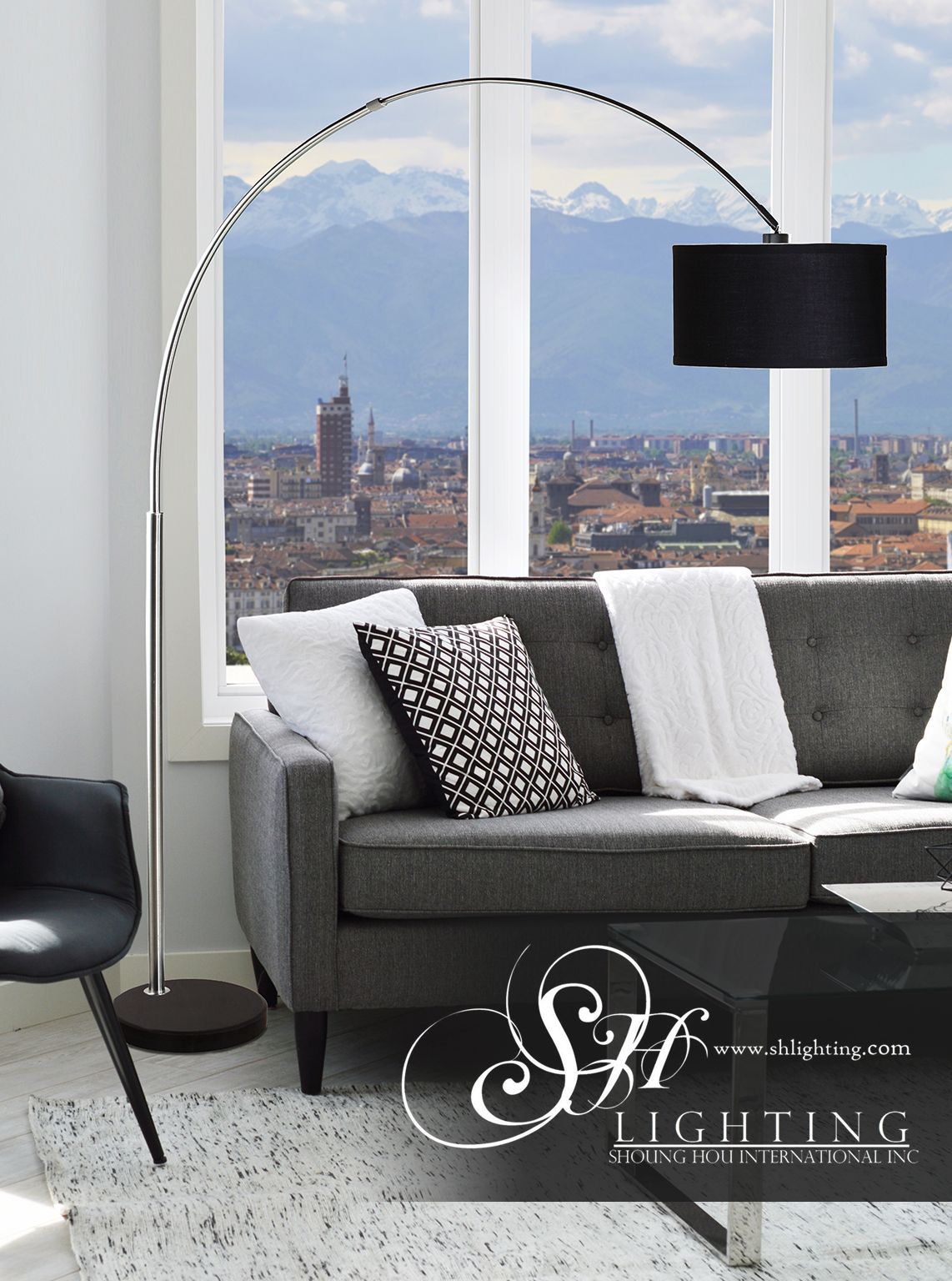 Sh Lighting 6938Bk - Brush Steel Arching Floor Lamp With Black Marble Base - Features Large Black Drum Style Shade - 81" Tall - Black