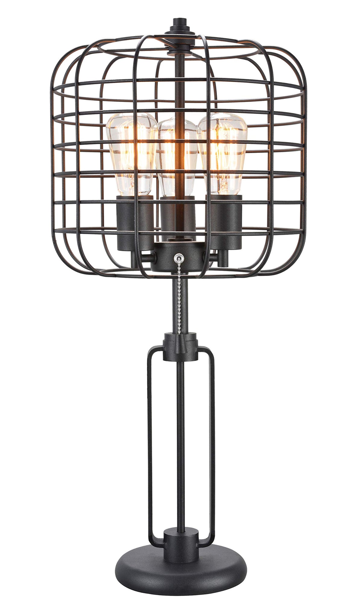 Featuring a matte black finish, this urban lamp will make a handsome addition to a variety of furniture arrangements and color palettes | Lamp features three Edison bulbs (included) which shine from within an industrial black metal cage shade | Black matte finished metal body. Overall: 26.5" height | Industrial cage shade measures 15" diameter by 12" height | All SH Lighting products are UL Listed for safety