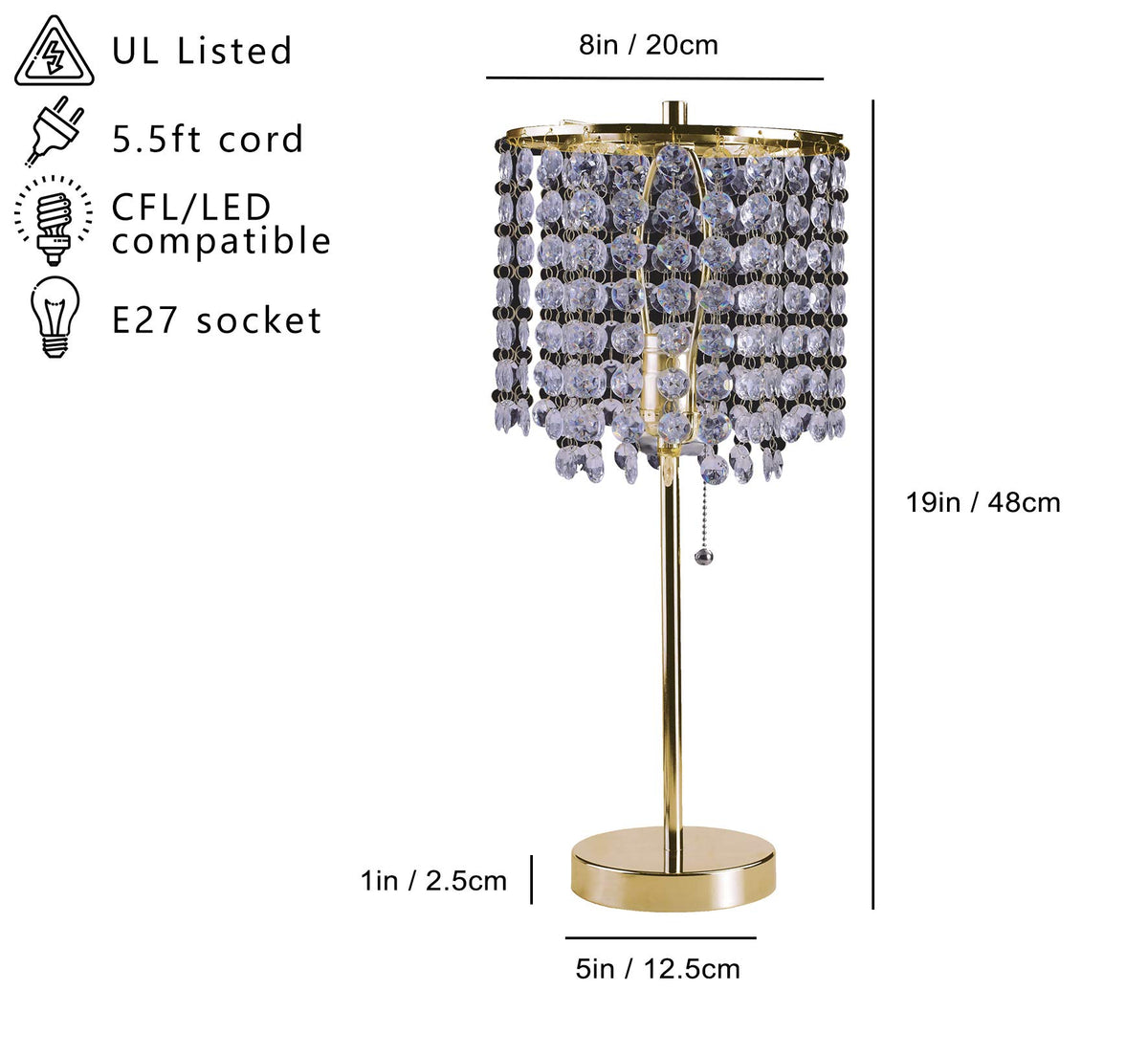 Sh Lighting Crystal Table Lamp - 19" Tall, Pull Chain, Gold For Bedroom & Living Room