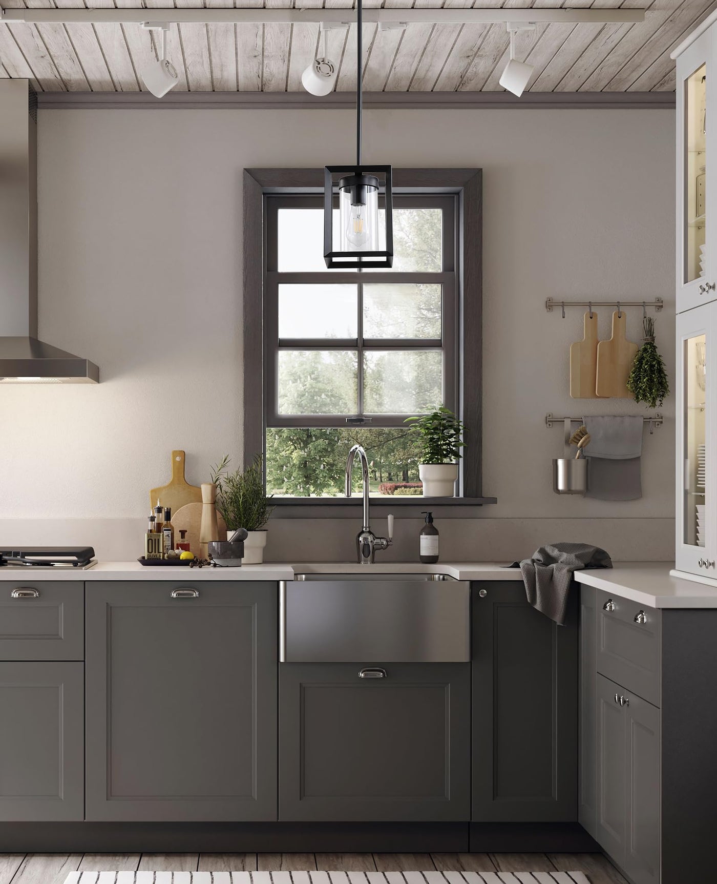 Q: What materials are used in the Sheenkarion pendant light's design?A: The pendant light features a high-quality matte black finish metal frame in a cuboid cage design, accompanied by a clear glass shade. This combination gives it a modern industrial look, perfect for enhancing the character of your home.