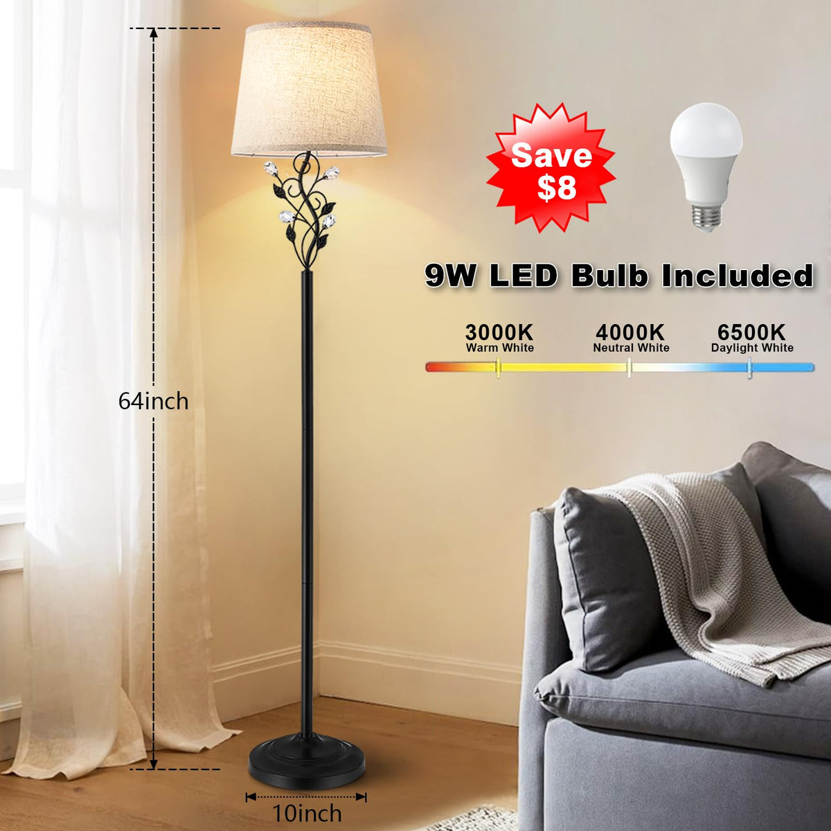 Sheeta 65 Floor Lamps For Living Room With 3 Color Temperatures Led Bulb, Standing Lamp Tall Farmhouse Floor Lamp With Rustic Le