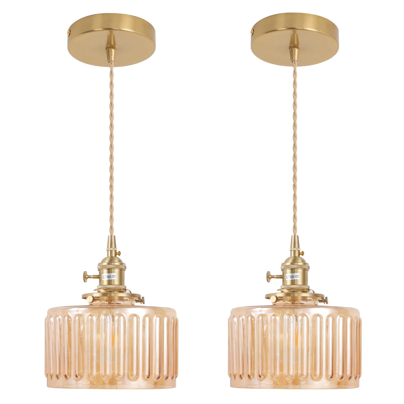 Shenmoyl Pendant Light 2 Pack With Amber Striped Glass Lmapshade, Brass Vintage Pendant Light Adjustable Hanging Light For Kitch