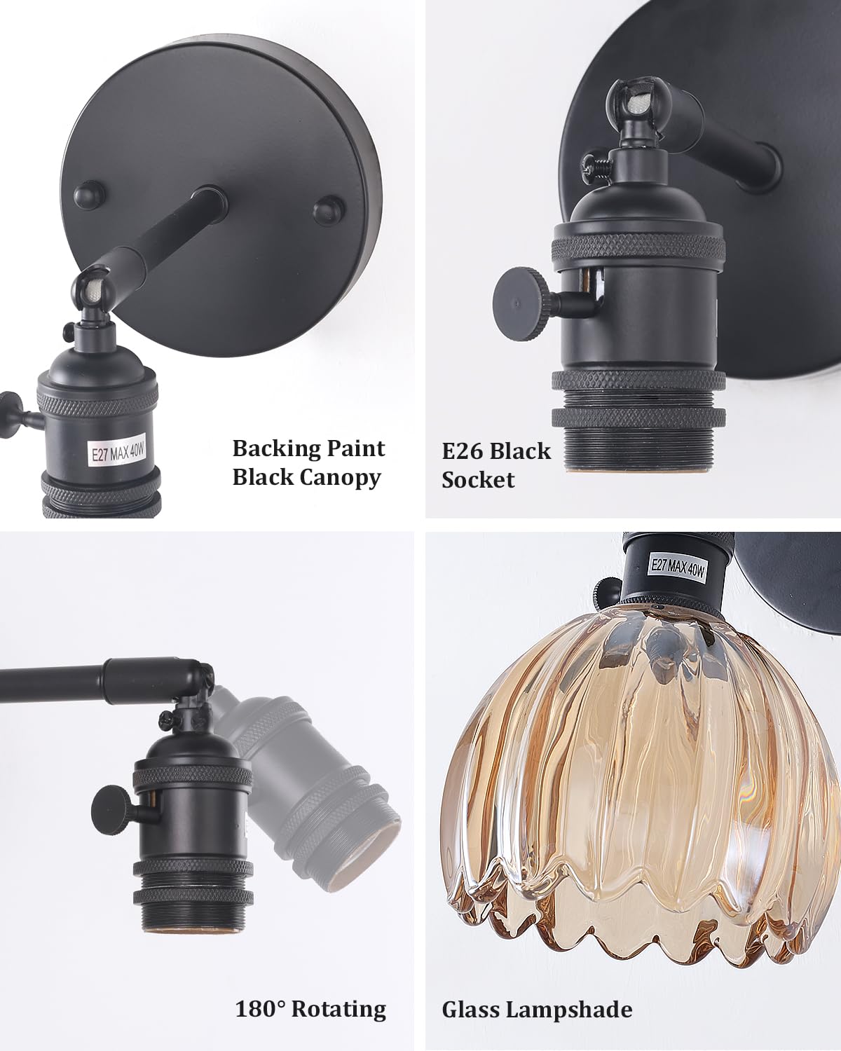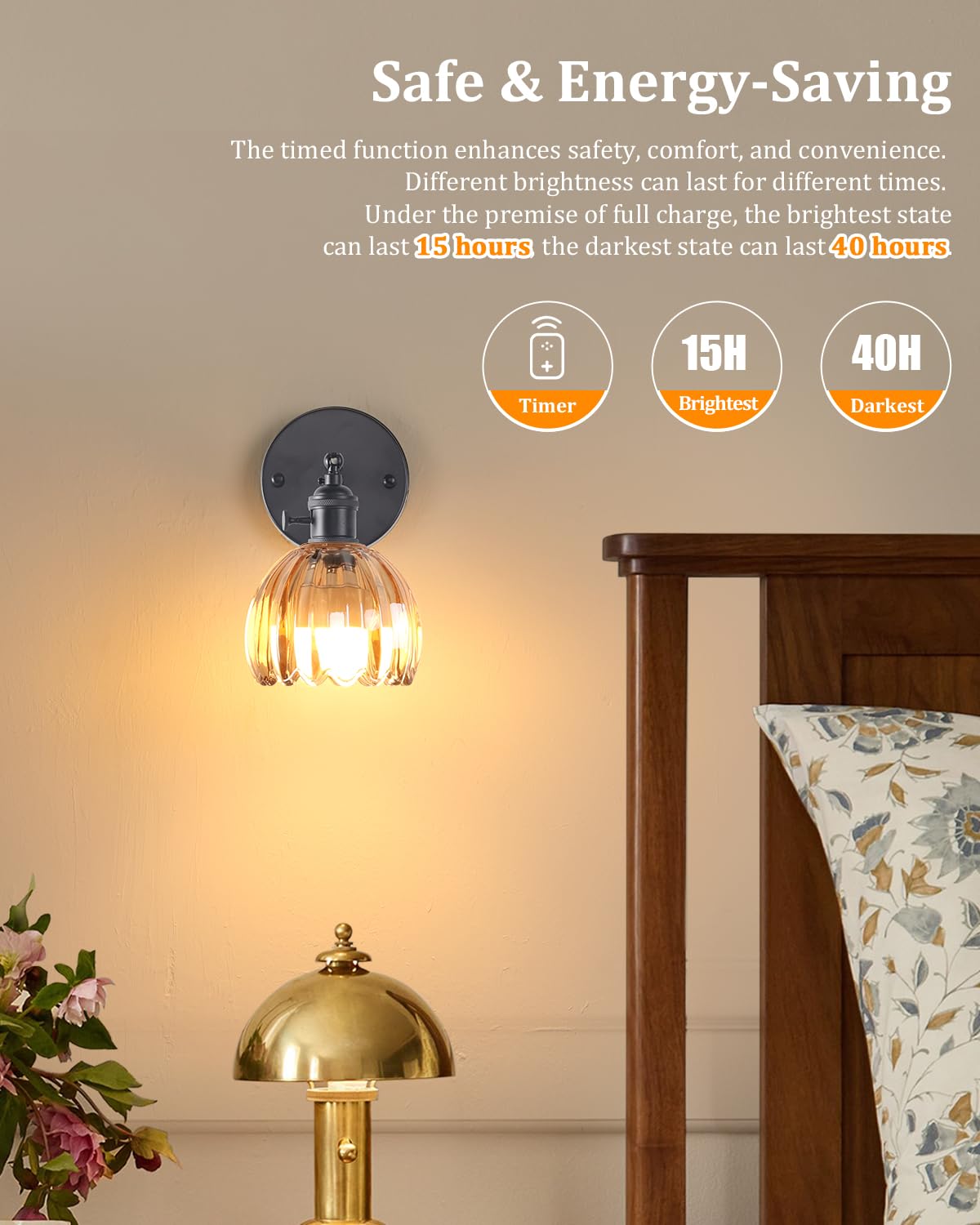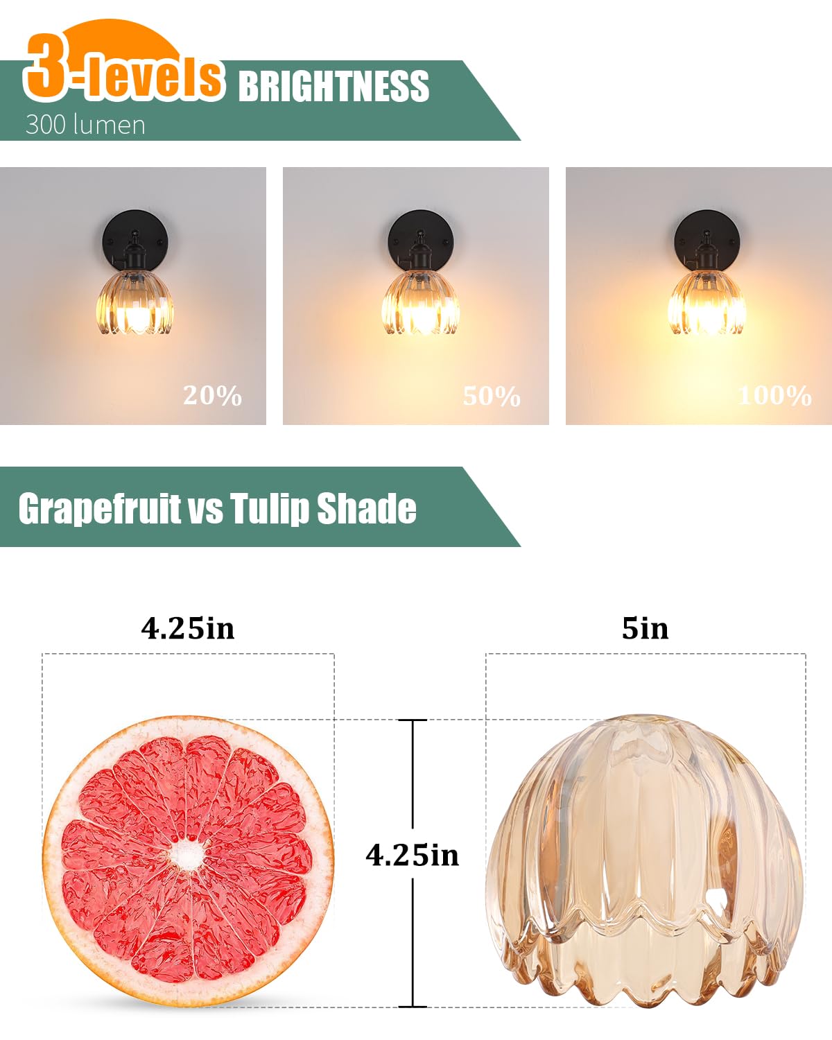 Shenmoyl Vintage Battery Operated Wall Sconce With Amber Tulip Glass Lampshade Wireless Rechargeable Battery Powered Black Wall