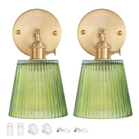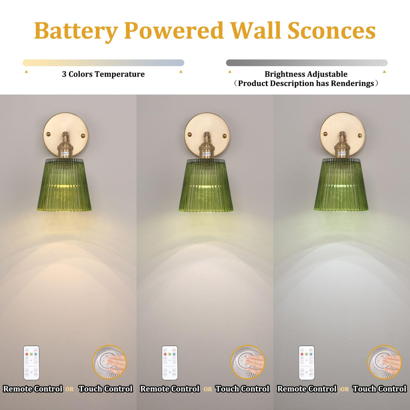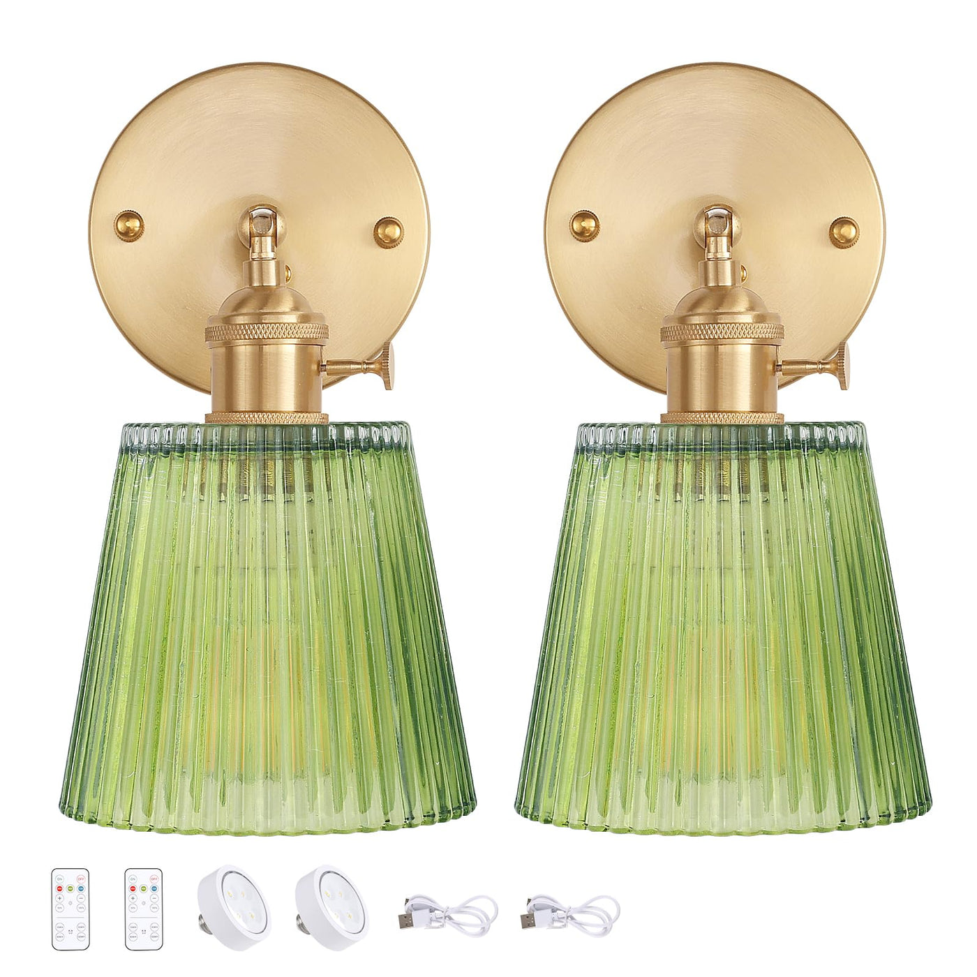 Shenmoyl Vintage Battery Operated Wall Sconce with Green Stripe Glass Lampshade Rechargeable Battery Powered Wall Light with Rem