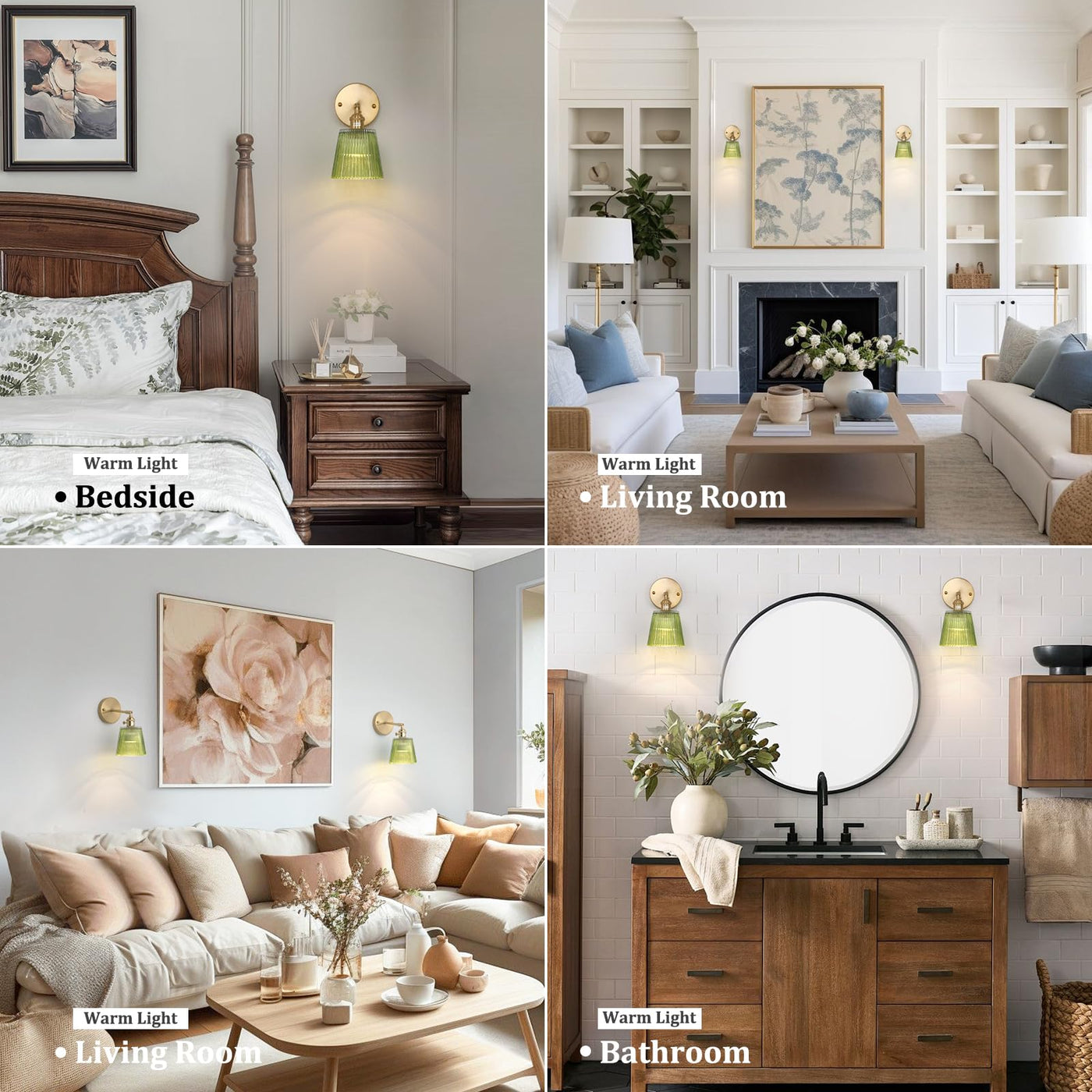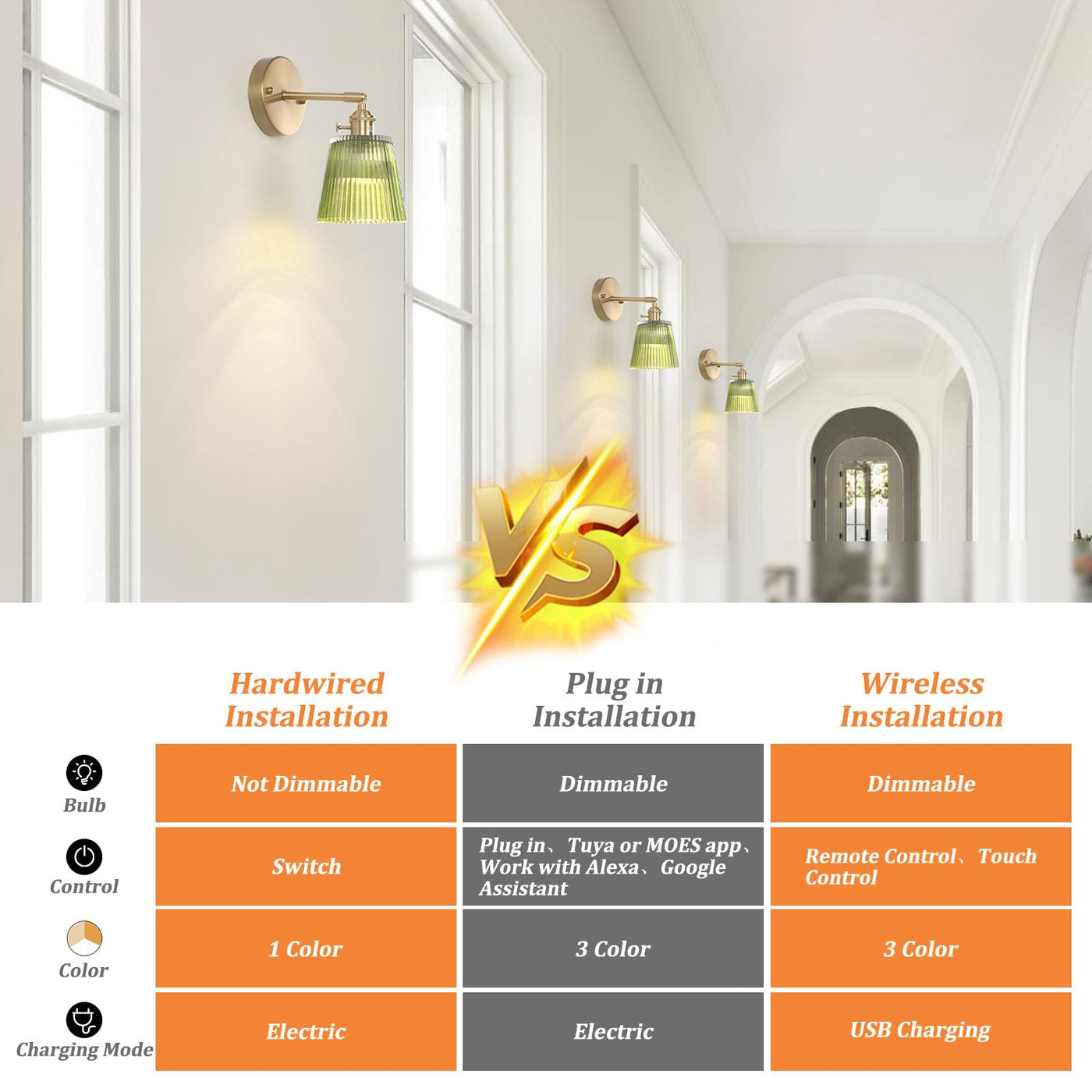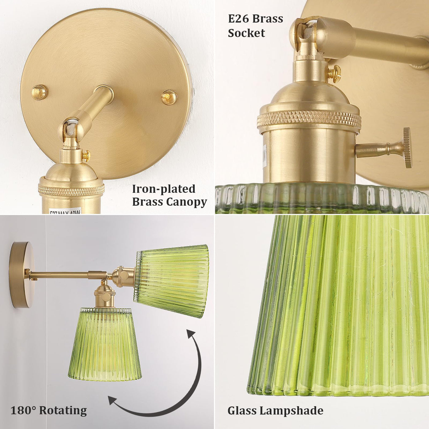 ?? Feature: Sending out simple but classic aesthetics. Its vintage shape matches with the whole light, ending up with a more retro and classic sense of beauty. The lampshade is made of high-quality glass material,which has good light transmission,non-glaring, simple and beautiful, easy to clean.Use rechargeable battery remote control light bulb, no wiring, easy installation. And can be controlled by remote control. We have a mature and systematic inspection process. All of the products get through strict inspection and make sure its quality before reaching your door. ?? Specification: Material: Glass+Metal Bulb: Included Lamp Base Type: E26 / E27 Compatible Bulbs: Compact Fluorescent, Incandescent, Halogen, and LED bulbs Type: Modern Glass Wall Sconces Style: Retro / Nodic / Vintage Style Lampshade Dimension: 4.96'' x 4.8'' (12 x 12.6cm) Rated Power: Max 60 watts. Direction of Light: 180 up and down adjustable angel Color: Green Color of The Lamp Holder: Brass Installed: No wiring battery operated ?? Package includes: 2 x Wall lamp?2 x battery operated bulb?2 x remote control?2 x usb cable ?? Warm Tip: If it's hard to install for you, please rent a licensed electrician to do this for you. For a longer service life, please install and use it in a dry environment