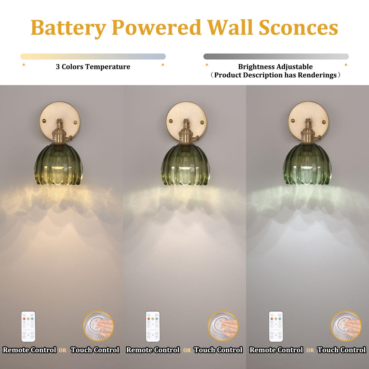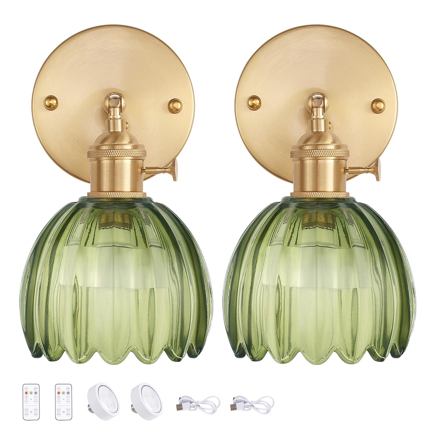 Shenmoyl Vintage Battery Operated Wall Sconce with Green Tulip Glass Lampshade Rechargeable Battery Powered Wall Light with Remo
