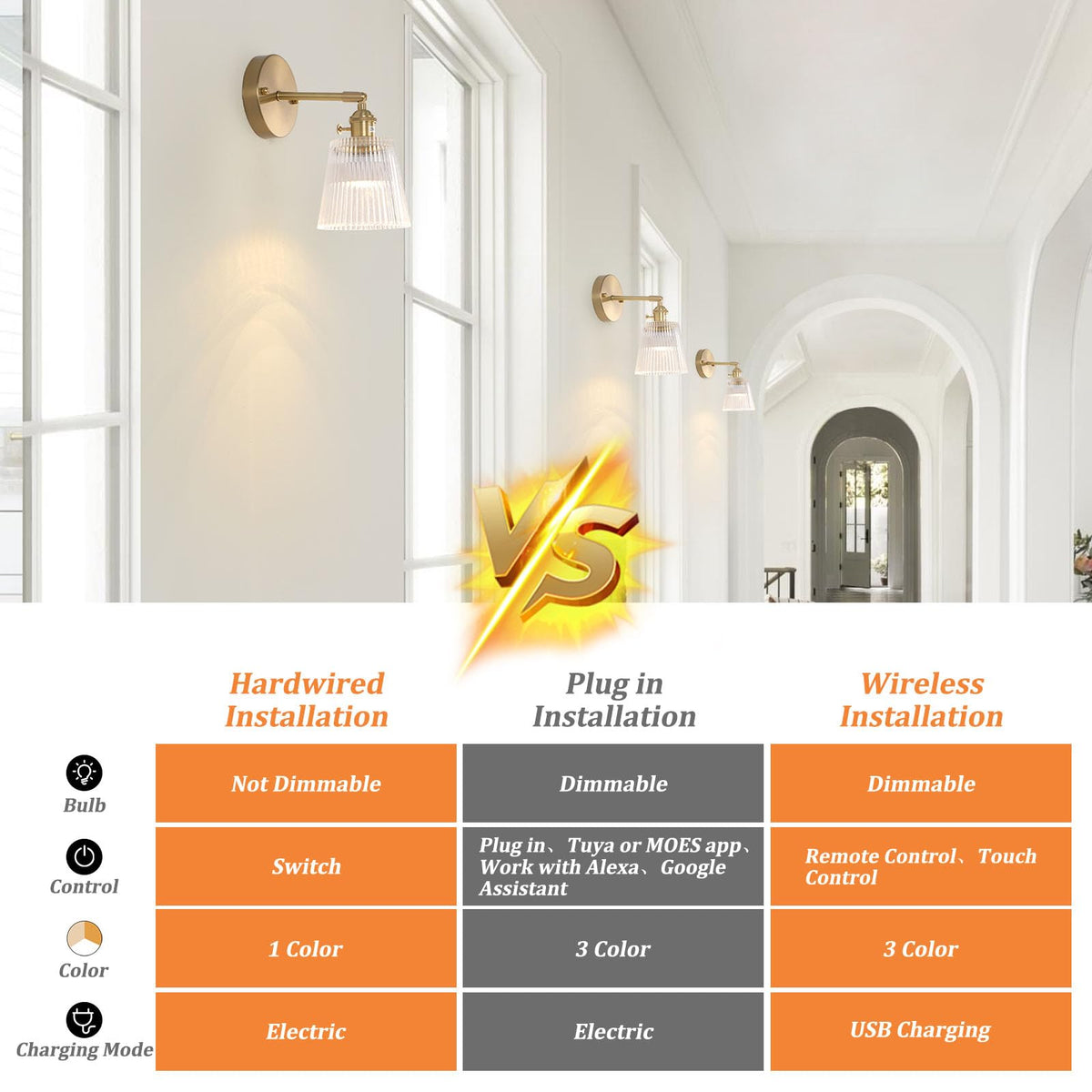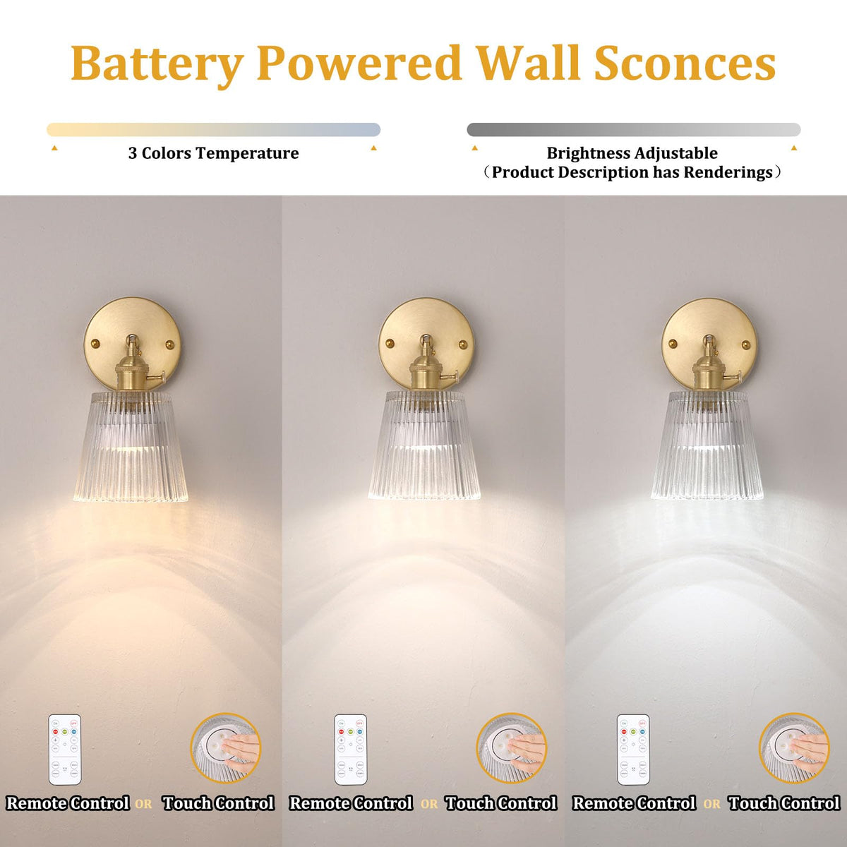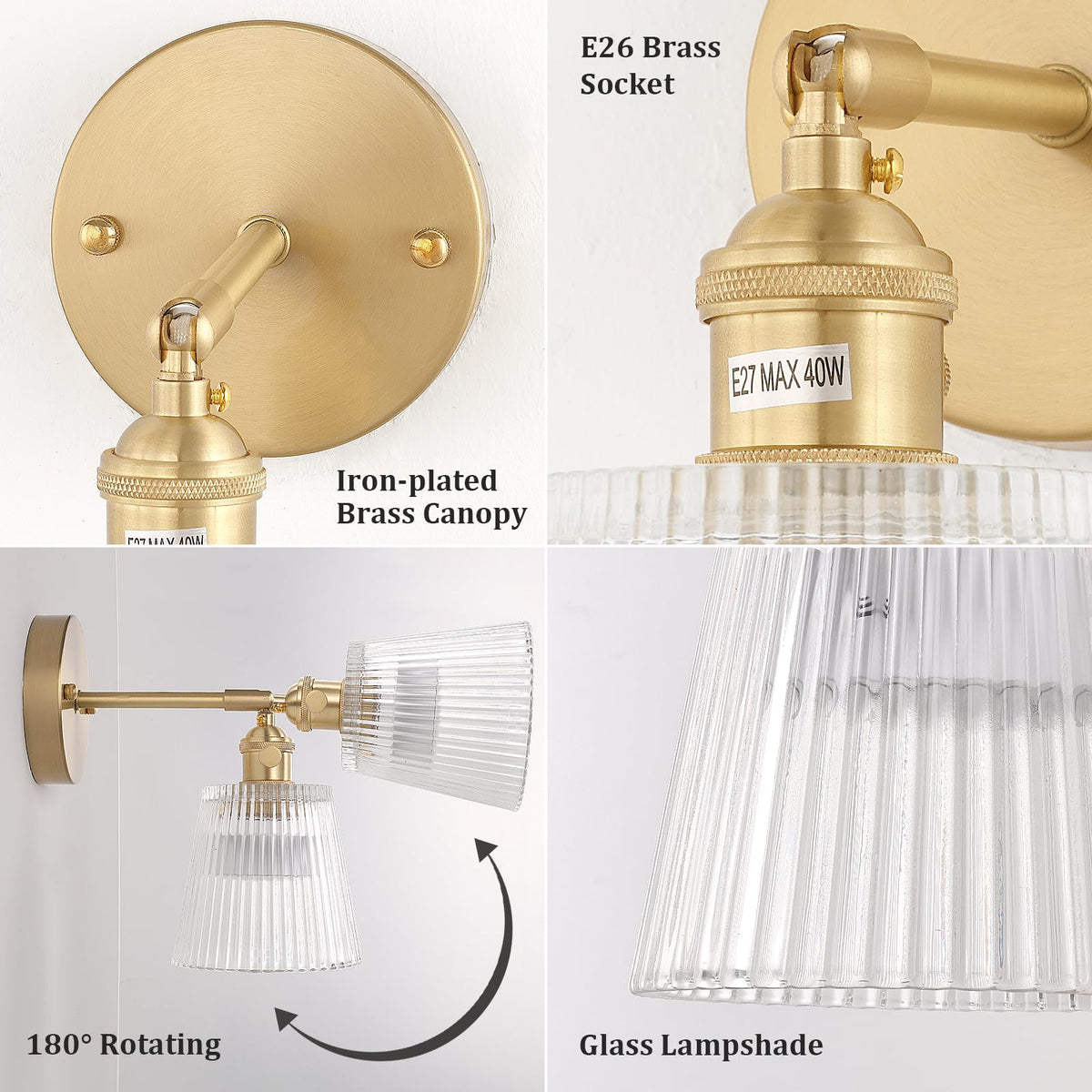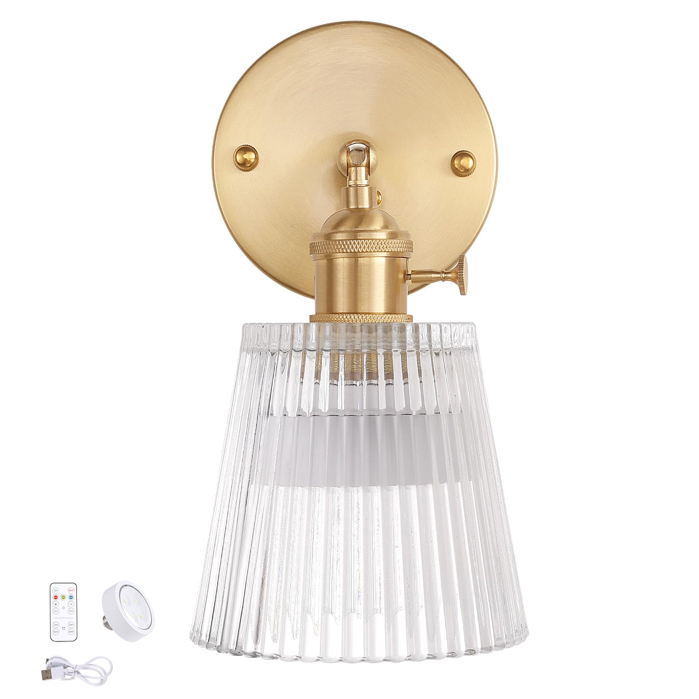 ?? Feature: Sending out simple but classic aesthetics. Its vintage shape matches with the whole light, ending up with a more retro and classic sense of beauty. The lampshade is made of high-quality glass material,which has good light transmission,non-glaring, simple and beautiful, easy to clean.Use rechargeable battery remote control light bulb, no wiring, easy installation. And can be controlled by remote control. We have a mature and systematic inspection process. All of the products get through strict inspection and make sure its quality before reaching your door. ?? Specification: Material: Glass+Metal Bulb: Included Lamp Base Type: E26 / E27 Compatible Bulbs: Compact Fluorescent, Incandescent, Halogen, and LED bulbs Type: Modern Glass Wall Sconces Style: Retro / Nodic / Vintage Style Lampshade Dimension: 4.96'' x 4.8'' (12 x 12.6cm) Rated Power: Max 60 watts. Direction of Light: 180 up and down adjustable angel Color: Transparent Color of The Lamp Holder: Brass Installed: No wiring battery operated ?? Package includes: 1 x Wall lamp?1 x battery operated bulb?1 x remote control?1 x usb cable ?? Warm Tip: If it's hard to install for you, please rent a licensed electrician to do this for you. For a longer service life, please install and use it in a dry environment