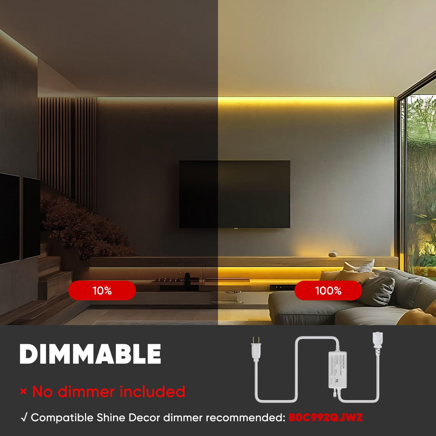 Shine Decor 6x10mm LED Strip LightThis dimmable LED Strip Light's series-parallel wiring configuration requires higher manufacturing skills to ensure higher fault tolerance and efficiency. Makes a more stable configuration and uniform glow distribution. This plug & play warm white light strip is a good choice for bedroom, living room, wine cabinet, and reception room and commercial illumination decoration, the premium 120LEDs/m flexible strip lights with super brightness helps creating your wanted lighting design and signs, suitable for both indoor and exterior use. Product Specification: Voltage: AC110-130V, no transformer needed Power: 5.3W/M Certificate: ETL-listed Waterproof Grade: IP65 LED Type: SMD 2835 LED Quantity: 120 LEDs/M Max. Run Length: 150FT Min. Bending Radius: 4cm Cutting Unit Length: 1.64ft/0.5m Cross Section Size: thickness 6mm x width 10mm Package Includes: 1x 150ft strip light with power cord> 1 x 20in heat shrink tube 90 x plastic mounting clip 180 x screw 1x User Manual Necessary accessories are included for use, order ASIN B07VGDJ6R1 for dimmer pack and B07Q5166NL for power cord pack if you need. Note: 1. Test and check the rope light s function before using or installing, unroll the light roll when testing its function performance. 2. When used for outdoor projects, make sure all the connections are silicone glue waterproofed and keep the plug away from water or wetness.