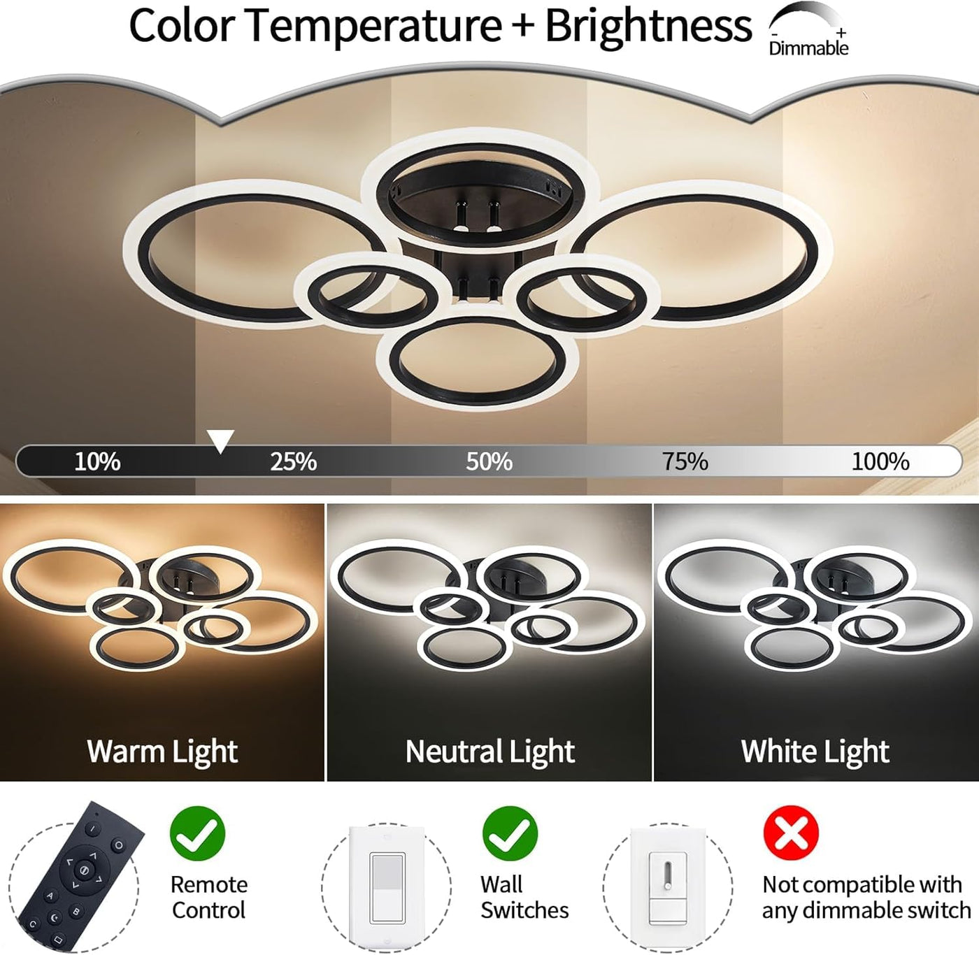 Shine Luest 6 Rings Black Modern Led Ceiling Light Fixture, Flush Mount Ceiling Light With Remote Dimmable Brightness, Adjustabl