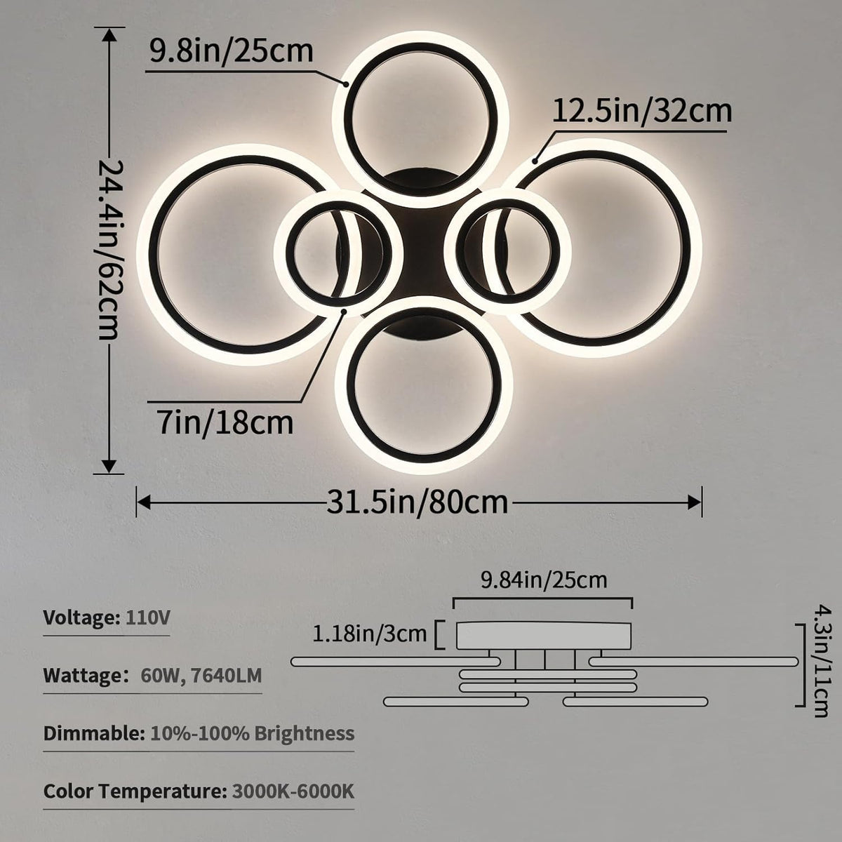 Q: What are the dimensions of the Shine LUEST 6 Rings Black Modern LED Ceiling Light?A: The Shine LUEST ceiling light has dimensions of 31.5 inches in length and 24.4 inches in width, making it a suitable choice for medium-sized rooms such as living rooms or bedrooms.