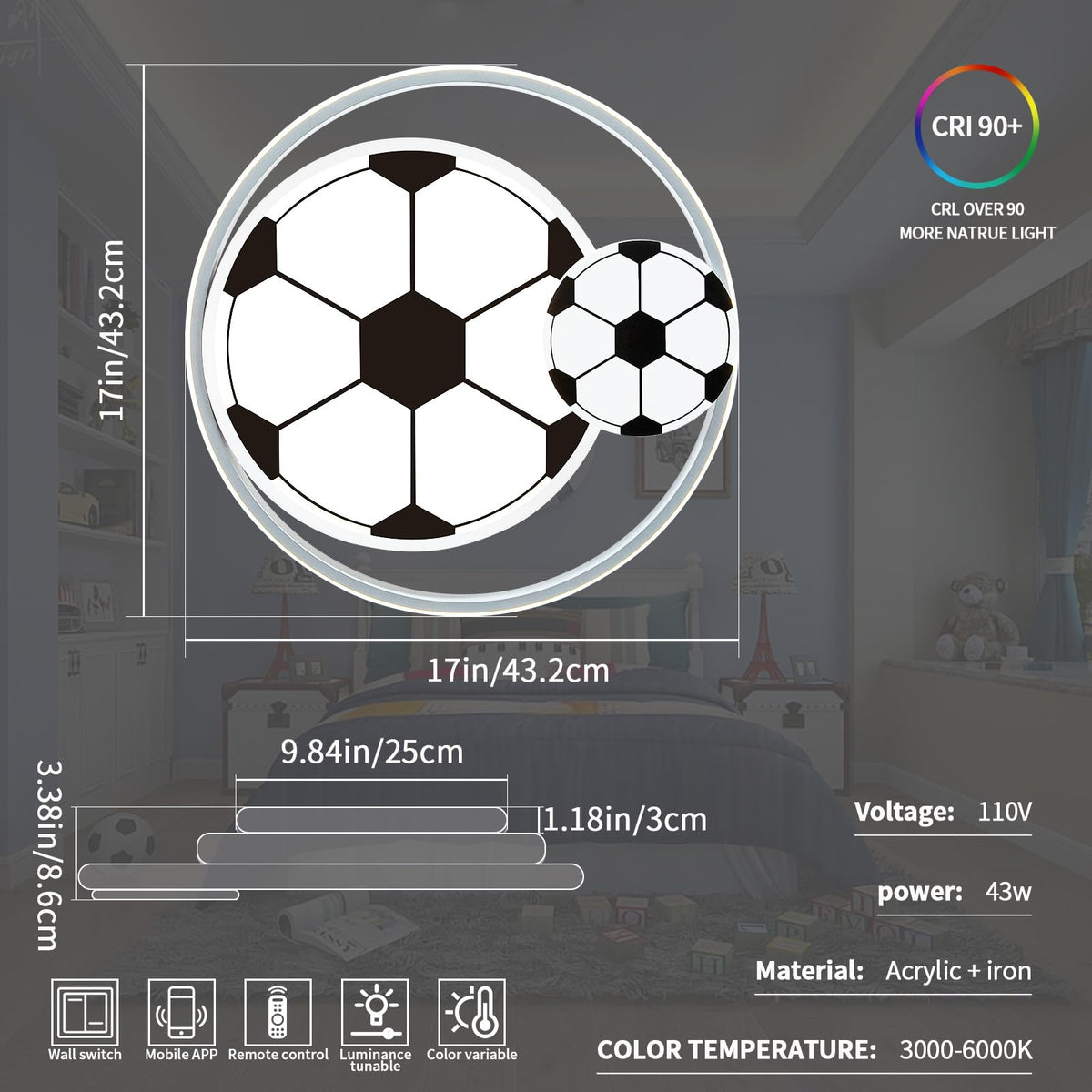 Specificationcategory: Close To Ceiling Lights, Led Lighting, Child'S Room Chandelier, Modern Bedroom Ceiling Light Fixturesinstall Type: Flush Mount Ceilingfeatured: Sports Football Style, Modern, Minimalist, Ultra-Thinshop By Room: Kids Room, Boys Bedroom, Living Room, Childs' Bedroom, Study Room, Toy Room, Nursing Roomnumber Of Lights: Led 43W Stepless Dimmable Lights Stripdimensionslight Fixture Diameter: 17''Light Fixture Thick: 3.4''Recommended Use Area: 80 ~ 200 Ftprocessing Technology: Iron Brushed Paintingvoltage: (Ac)110Vwattage: 43Wis Dimmable: Yescontrol Methods: Wall Switch, Remote Control (Package Included), Mobile Phone App (Bluetooth Connect) Controlmaterial: Metal + Wood + Acryliccolor: Black + Whiteplease Pay Attention To Installation:After Receiving The Package, Please Check The Product Integrity First, This Product Contains 1X Ceiling Light Fixture, 1 X Remote Control (No 2 X Aaa Battery Include), 1 X User'S Manual, 2 Pack Expansion Screw.Please Turn Off The Power Before Installation.Please Install Under The Guidance Of Professionals.This Product Contains Small Parts, Beware Of Accidental Ingestion By Children.