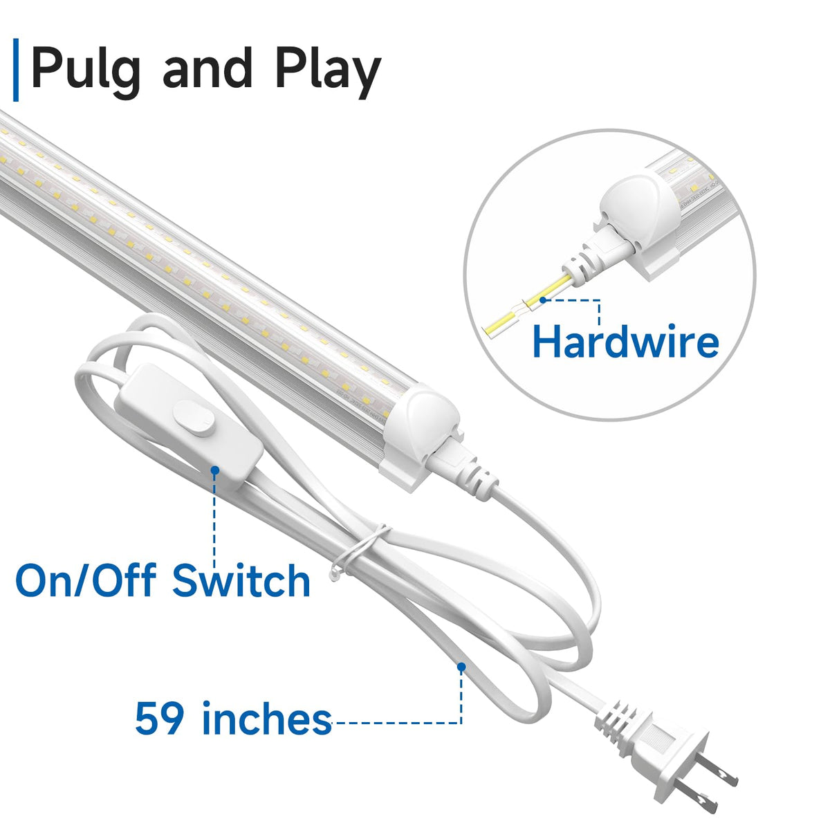 Package: 12 x 8FT LED Tube Light 12 x Seamless Connector 12 x Connecting Cable(4 Inches) 12 x Extension Cable(12 Inches) 12 x Power Cord with On/Off Switch(59 Inches) 12 x Installation Clips