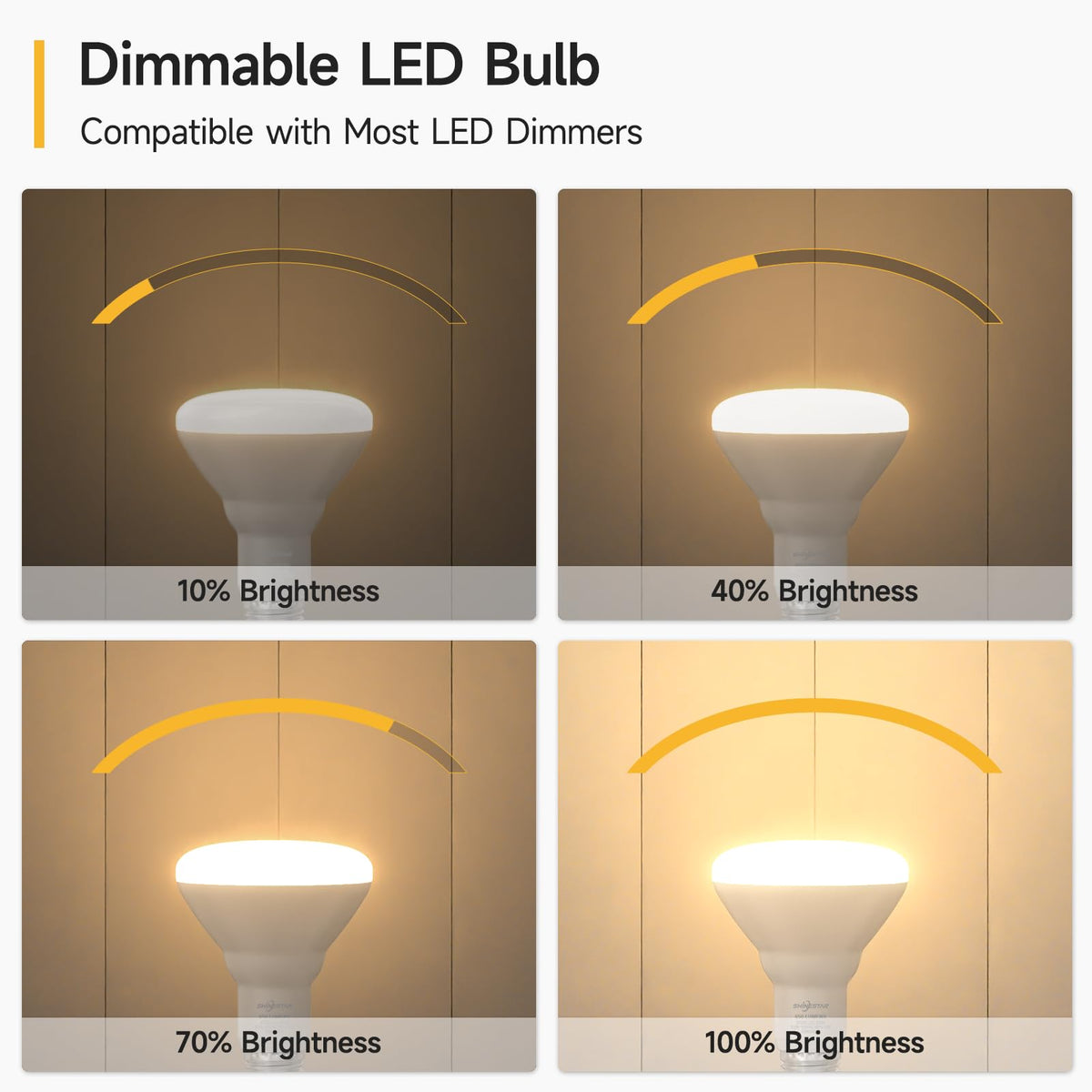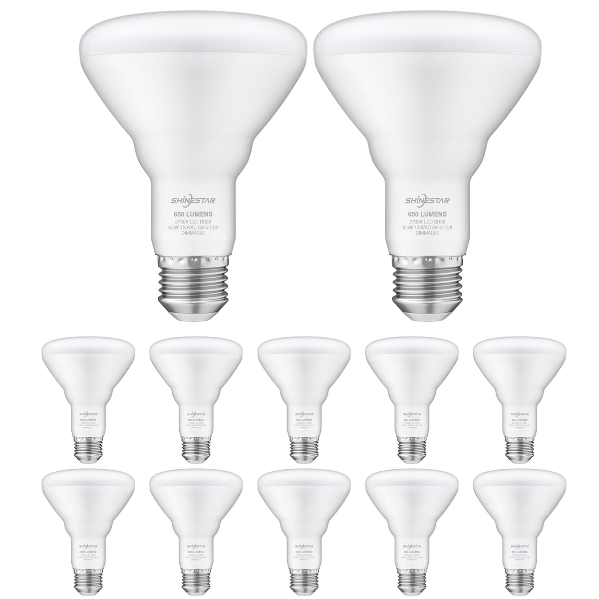 SHINESTAR BR30 Dimmable LED Floodlight with an E26 base is a versatile and energy-efficient lighting option commonly used in residential and commercial settings. This floodlight is often used in recessed lighting fixtures, track lighting, and canister lights. The E26 base is a standard screw-in base commonly found in household light fixtures. The dimmable feature of this floodlight allows you to adjust the brightness level according to your preference or the specific lighting needs of a room. It provides the flexibility to create different atmospheres and moods and can save energy by reducing the light output when maximum brightness isnt necessary. Our floodlight is available in various color temperatures, such as 5000K daylight, 2700K warm white, etc., which allows you to choose the lighting color that suits your preferences and the specific environment.SpecificationMaterial: PlasticWattage: 8.5wBulb Shape Size: BR30Bulb Base: E26Voltage: 120 VoltsColor Temperature: 5000K (Daylight)Number of Items: 6 pack/12 packBrightness: 650LMWarm Tips1. Before purchasing or installing the floodlight, ensure your dimmer switch is compatible with dimmable LED bulbs. And make sure the dimmer switch is specifically designed for LED bulbs for smooth and flicker-free dimming performance.2. If youre uncertain about the ideal dimming level, start with the lowest setting and gradually increase it until you achieve your desired brightness level. 3. Check the maximum load capacity of the dimmer switch to avoid overloading the dimmer switch by connecting too many floodlights.