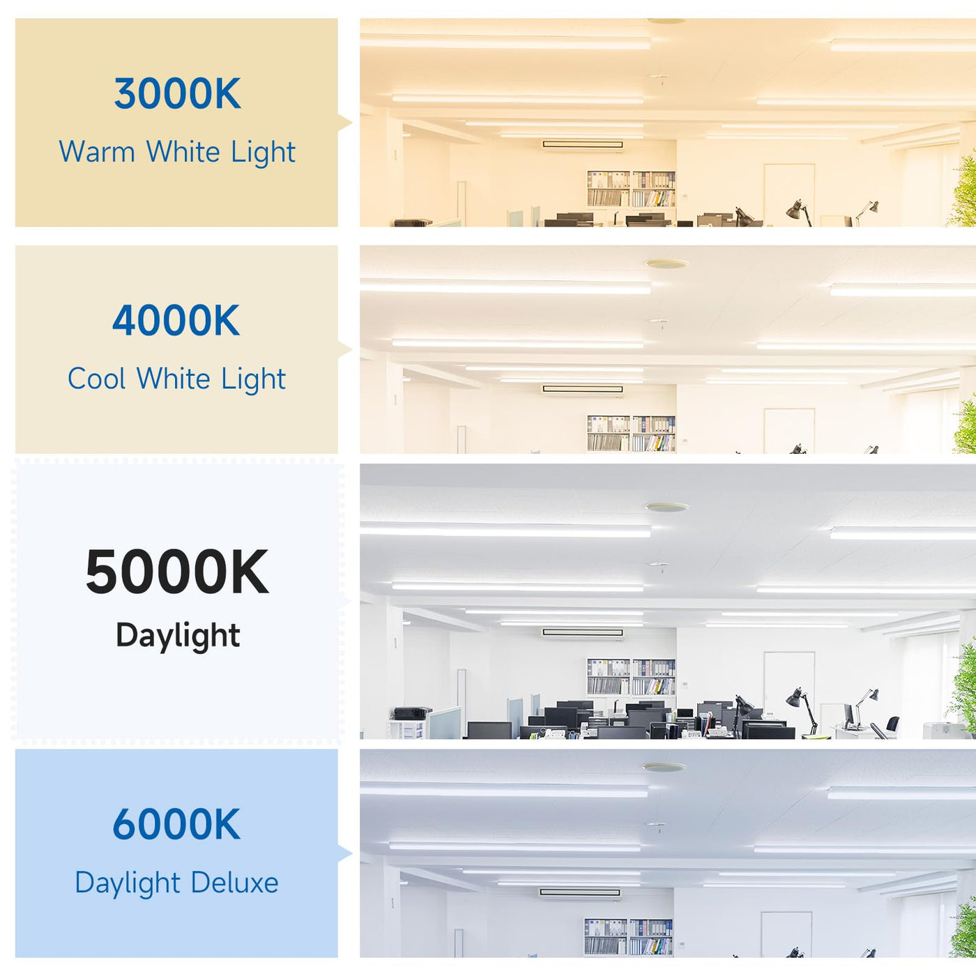 Specification: Voltage: 85-277V AC Power: 72W(150w equivalent) Lumen: 9000lm CCT: 5000K daylight white Length: 8FT(240cm) Beam Angle(V Shape): 270 degree Materials: Clear PC+Aluminum alloy Color Render Index: 80+ Lifespan: About 50,000hrs Dimmable or not: No Waterproof or not: No Note: 1. They are not dimmable, dont use them with a dimmer switch. 2. They are not waterproof, keep away from rainwater leaching. 3. The light is single-end connection, connect it by the attached power cord or hardwire diretly. 4. The light is linkable, but you can only connect up to 2 lights in series. 5. Pls turn off the power before installation to ensuring safety. Package: 20 x 8FT LED Tube Light 20 x Seamless Connector 20 x Connecting Cable(6 Inches) 20 x Extension Cable(12 Inches) 12 x Power Cord with On/Off Switch(59 Inches) 20 x Installation Clips