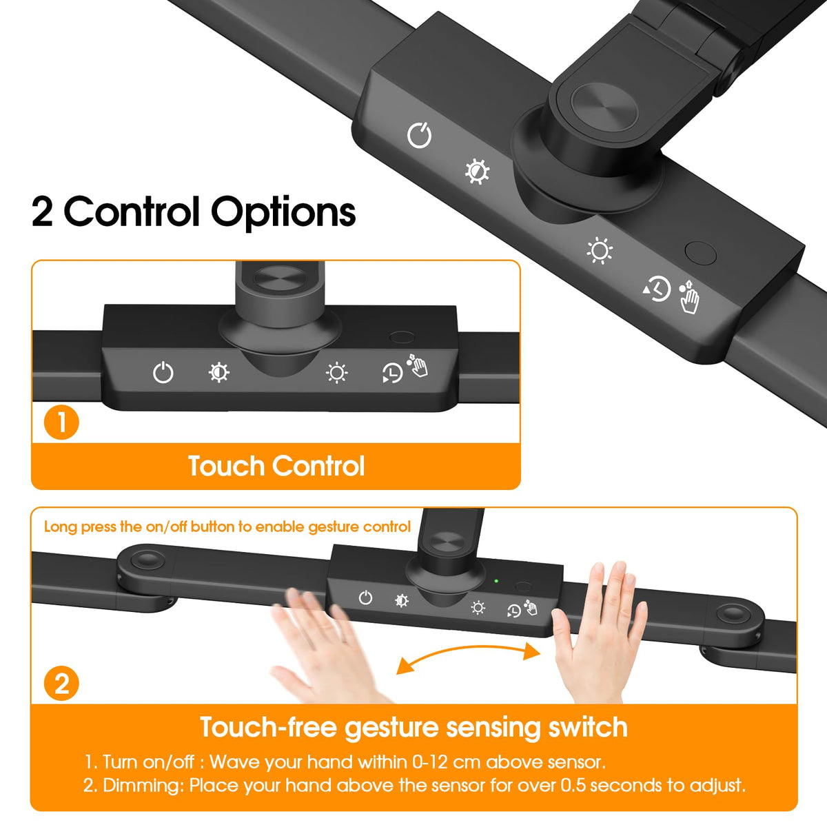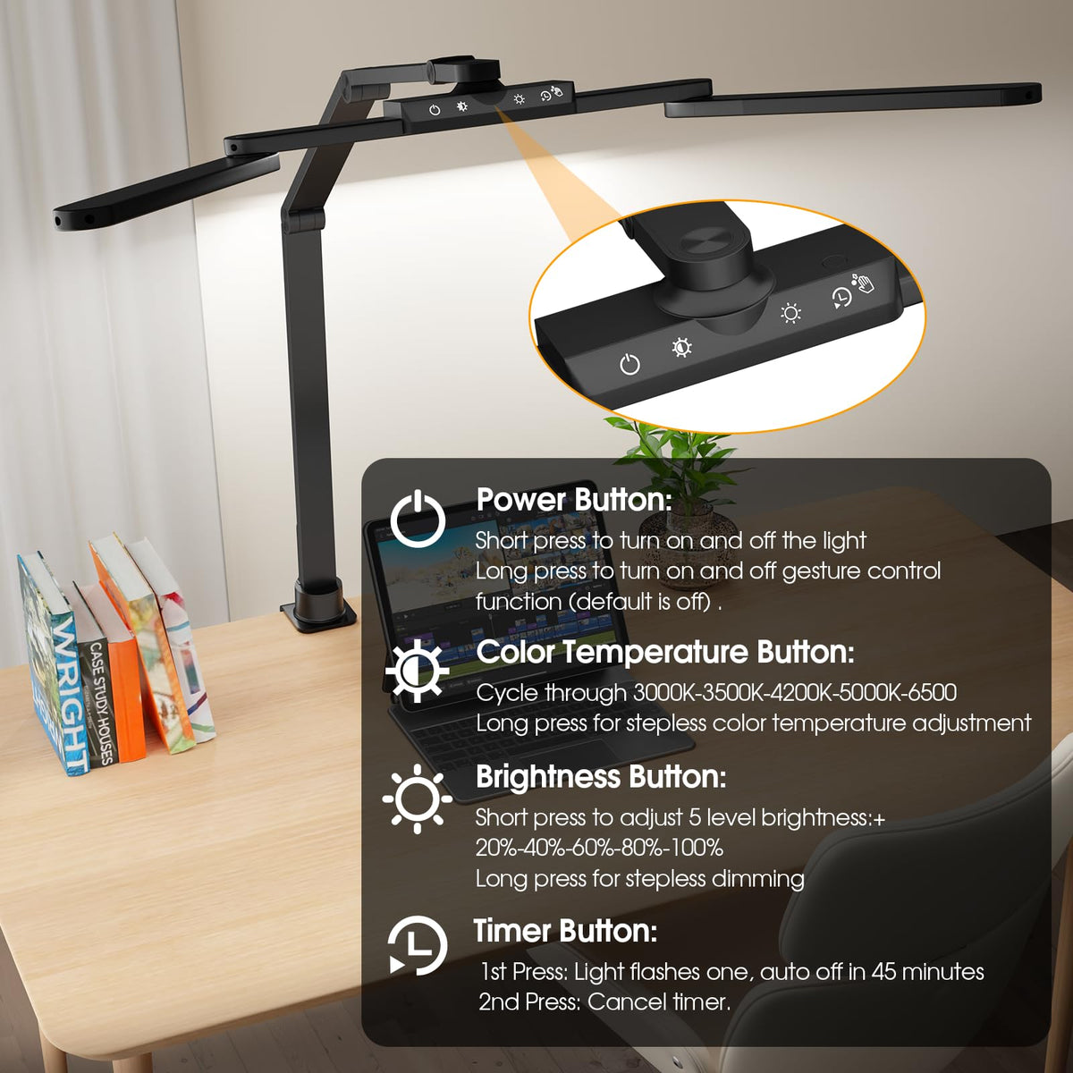 Q: What are the main features of the ShineTech LED Desk Lamp?A: The ShineTech LED Desk Lamp includes advanced gesture control for touchless operation, 25 customizable lighting modes with different brightness levels and color temperatures, a 45-minute auto-off timer, and a memory function to recall your last settings. It also features a flexible design with adjustable height and a sturdy clamp for secure mounting.