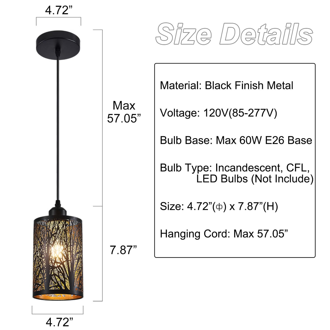 Q: What is the size of the pendant light fixture?A: The pendant light has a diameter of 4.72 inches and a height of 7.87 inches. Its compact size makes it suitable for various indoor spaces, including kitchens, dining rooms, and bedrooms.