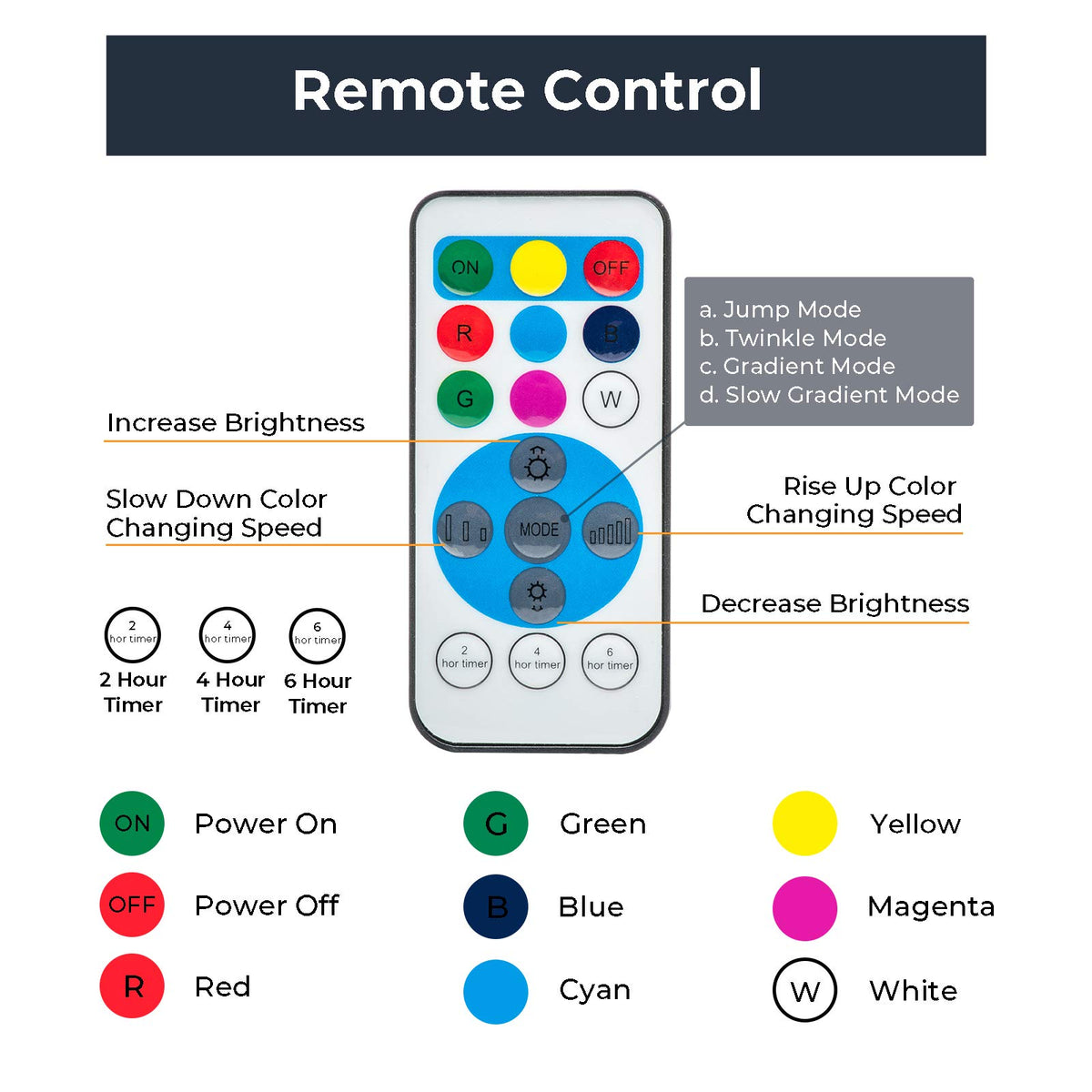 Q: How many colors and modes do the underwater lights offer?A: These underwater lights feature 7 stable colors, including yellow, green, red, blue, magenta, cyan, and white, along with 4 color-changing modes. You can easily switch between these options using the remote control.