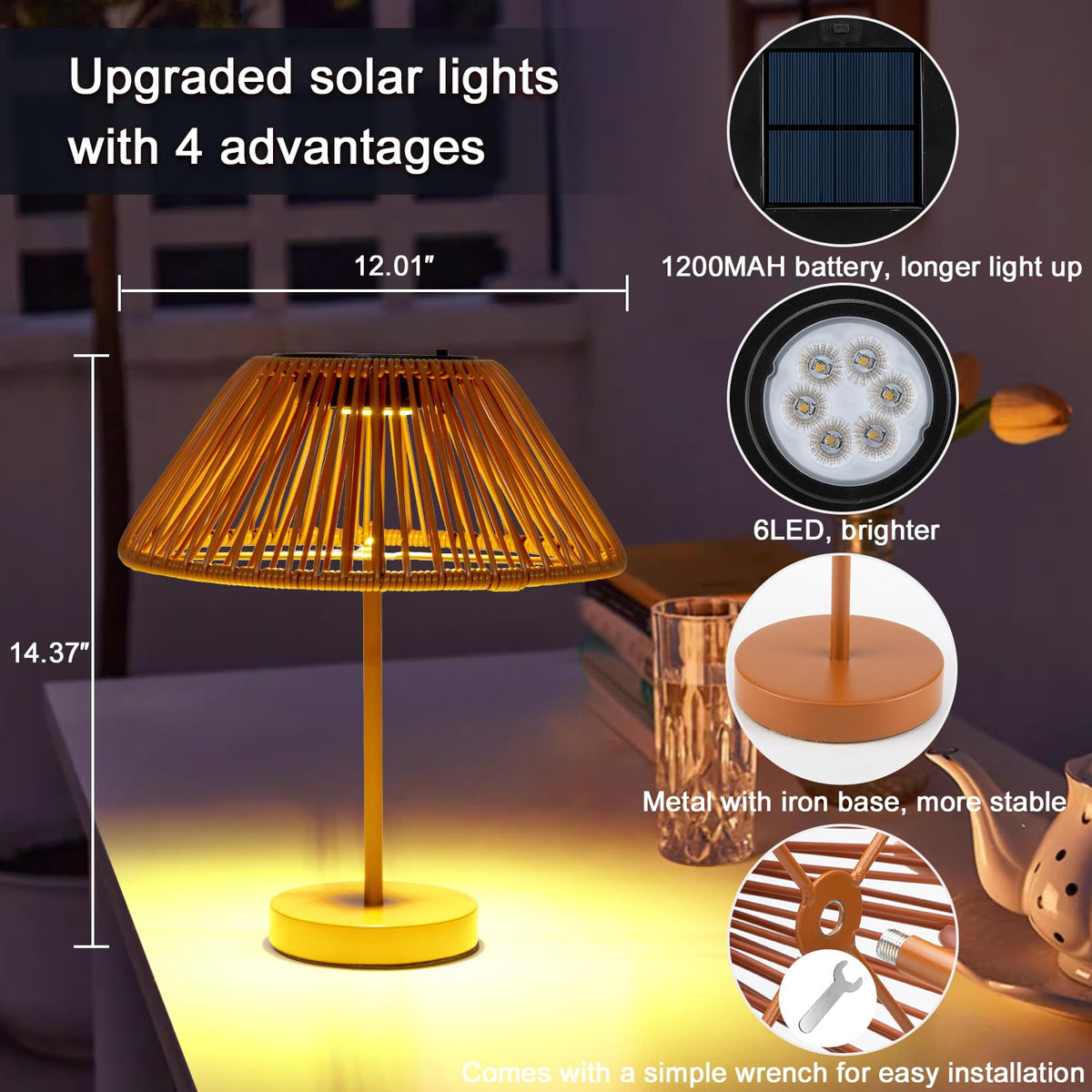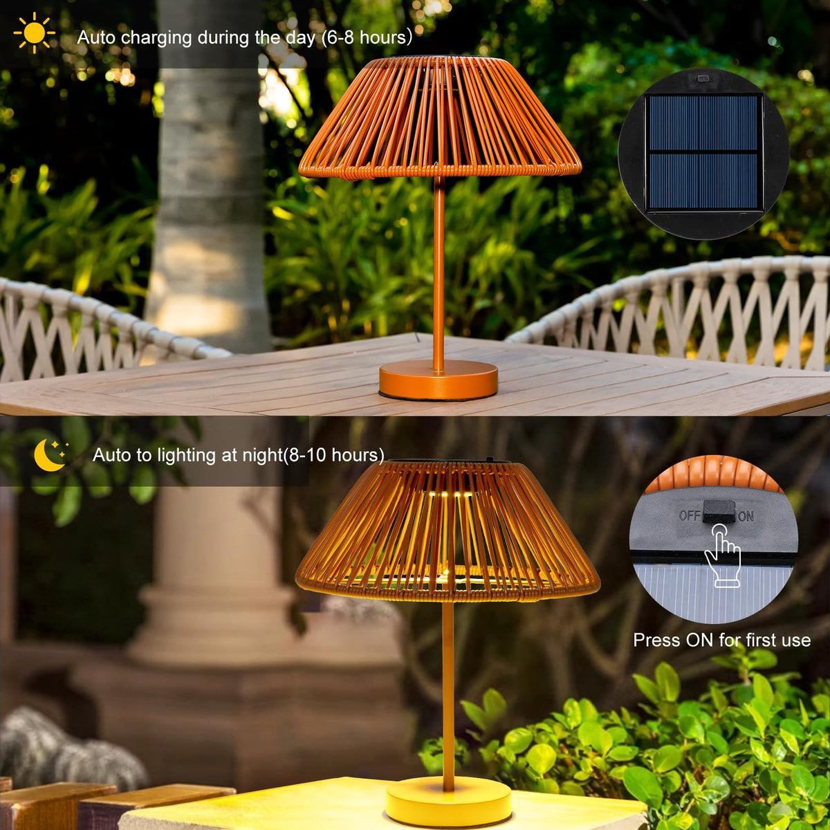 - **Stylish Solar Lamp**: Crafted from premium hand-woven rattan, this lamp offers a comfortable texture and a chic aesthetic. With upgraded drip 6 LED lights, it serves as both a practical light source and a stylish decor piece for any occasion.