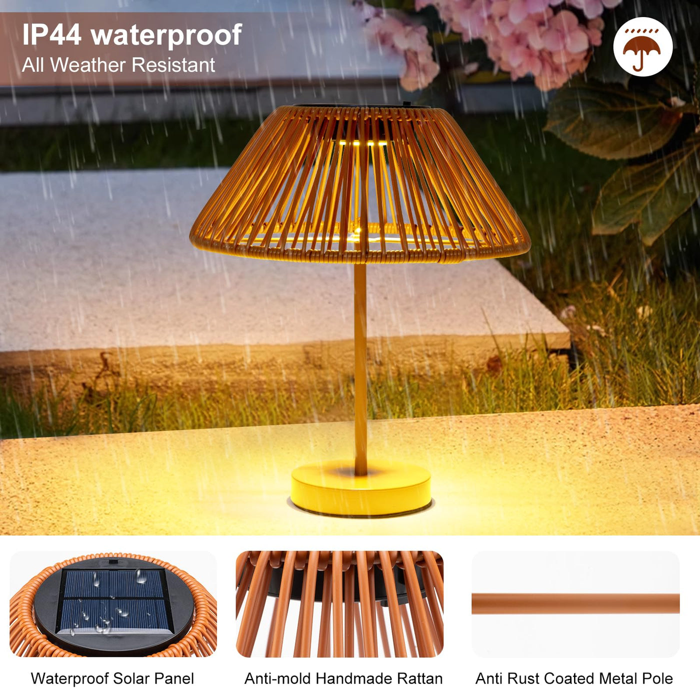 - **Waterproof and Durable**: Featuring an IP44 waterproof rating, the Shumi Solar Table Lamp is built to withstand the elements. The high-quality rattan weaving and rust-resistant pole ensure longevity, while the windproof iron block weighted base provides stability against harsh weather conditions.