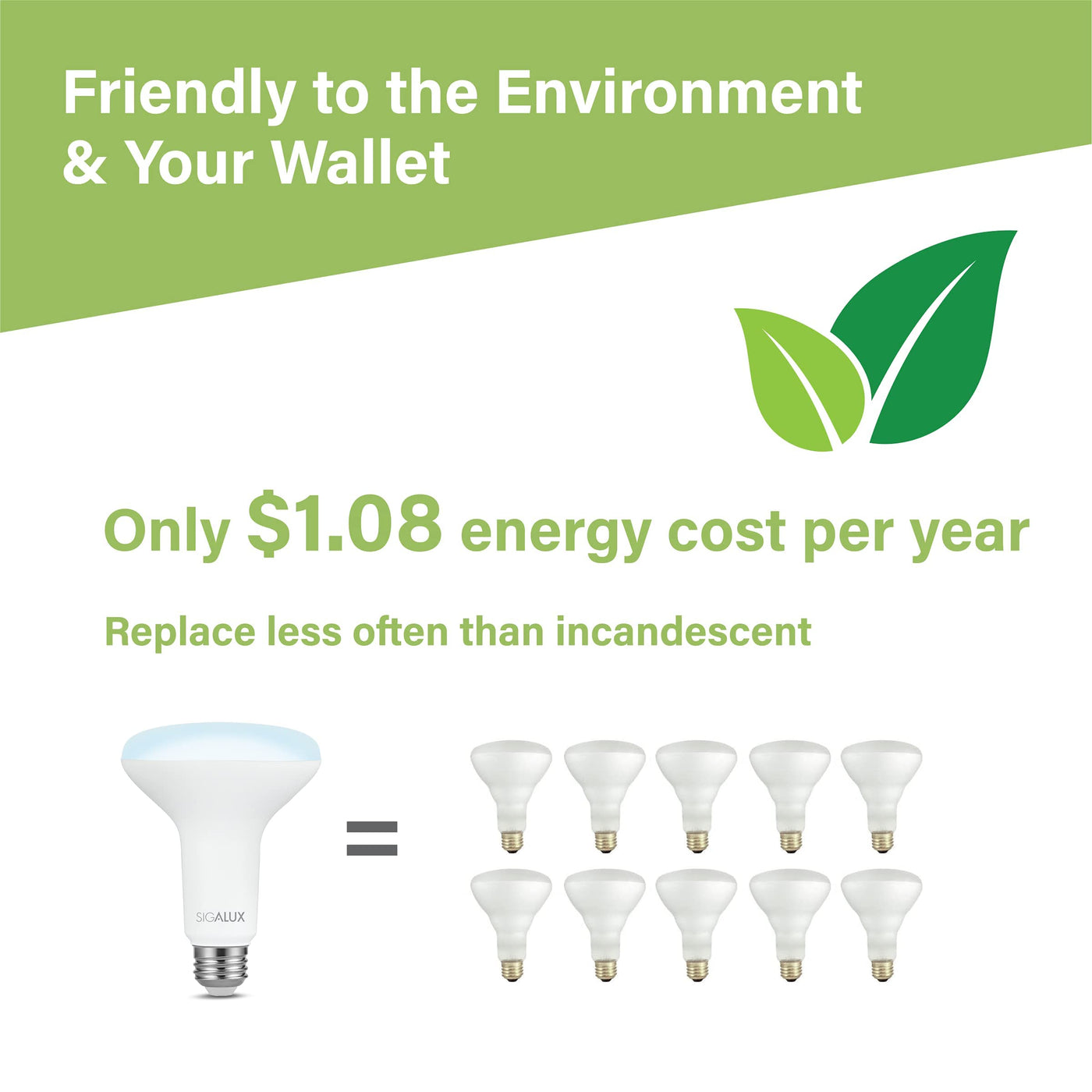 Smooth Dimming: Compatible with most LED dimmers for smooth quiet dimming ranging from 100% to 10%. Flicker-free soft, comfortable light. | Application: Fits 5" or 6” recessed cans with E26 medium base. Perfect for your bedroom, living room, or dining room ceilings and offers a standard 110° Beam Angle that spreads light to more areas of the room. | Energy & Cost Saving: Lower energy consumption instantly (up to 80%) by replacing 65W BR30 bulbs with the Sigalux dimmable LED BR30. This bulb costs only $1.08 per year to operate (based on 3 hours/day, 11 cents/kWh; may vary depending on rates and use). | Great for Concentration: Crisp, energizing 5000K daylight (close to sunlight), perfect for tasks that requires focus. CRI (Color Rendering Index) 80 makes colors look more true-to-life. | Replace Less Often: Each long-lasting 12,000 hour energy-efficient BR30 bulb will last over 10 years (based on 3 hours/day). Great for hard-to-reach areas and high-ceiling applications. | Suitable for damp location.Sigalux LED light bulbs are UL-Listed and certified by rigorous safety standards. Not for sale in California.