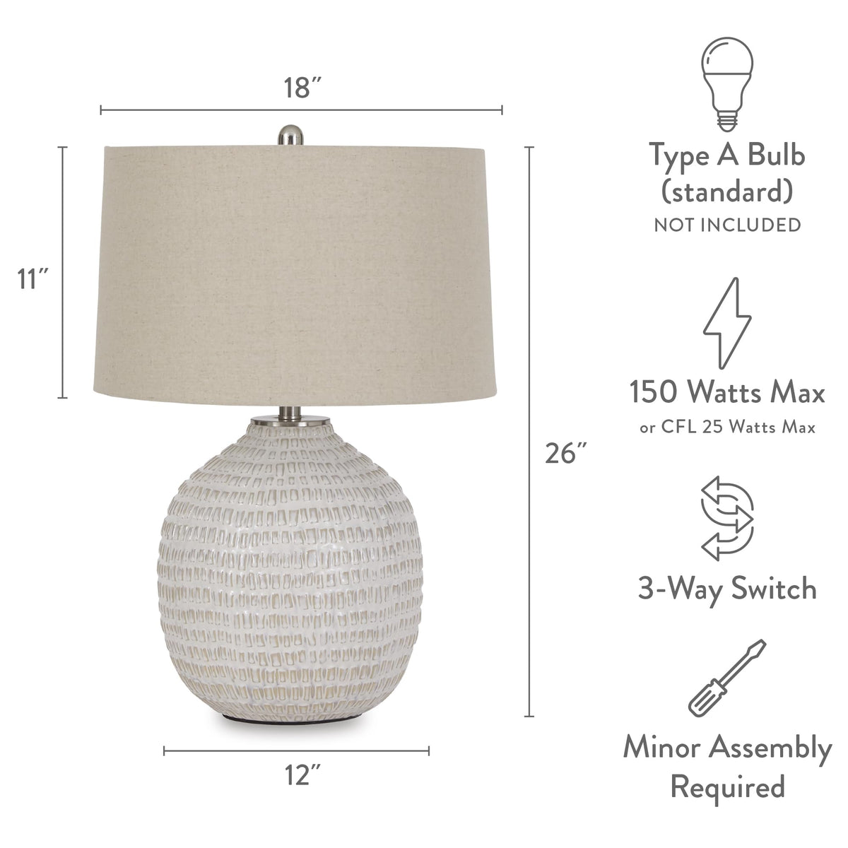 Q: What is the size of the Signature Design by Ashley Jamon Table Lamp?A: The Signature Design by Ashley Jamon Table Lamp measures 18 inches in width, 18 inches in depth, and 26 inches in height, making it a perfect fit for bedside tables, desks, or end tables.