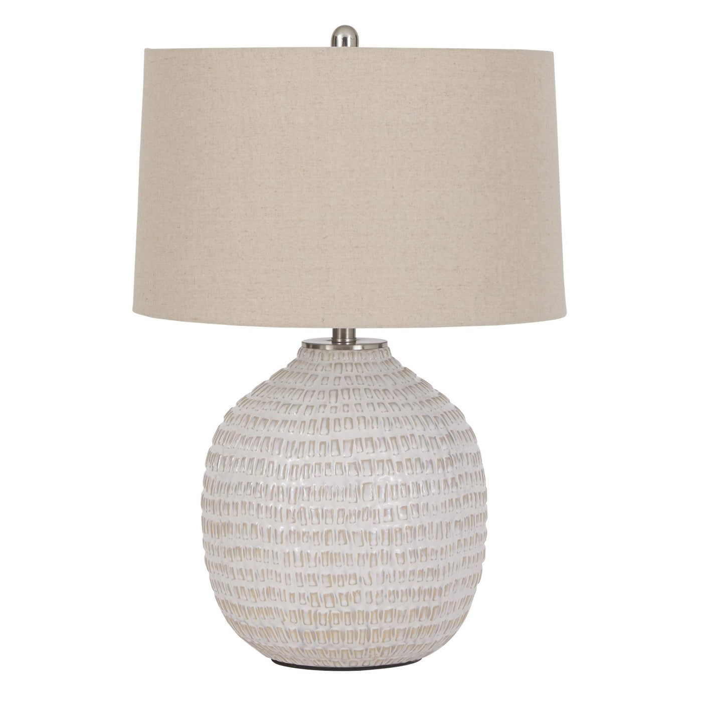 Q: What materials are used in the construction of this lamp?A: The lamp features a round ceramic base that has a textured finish and a two-tone glaze. It is topped with a light beige fabric shade that adds a touch of elegance.