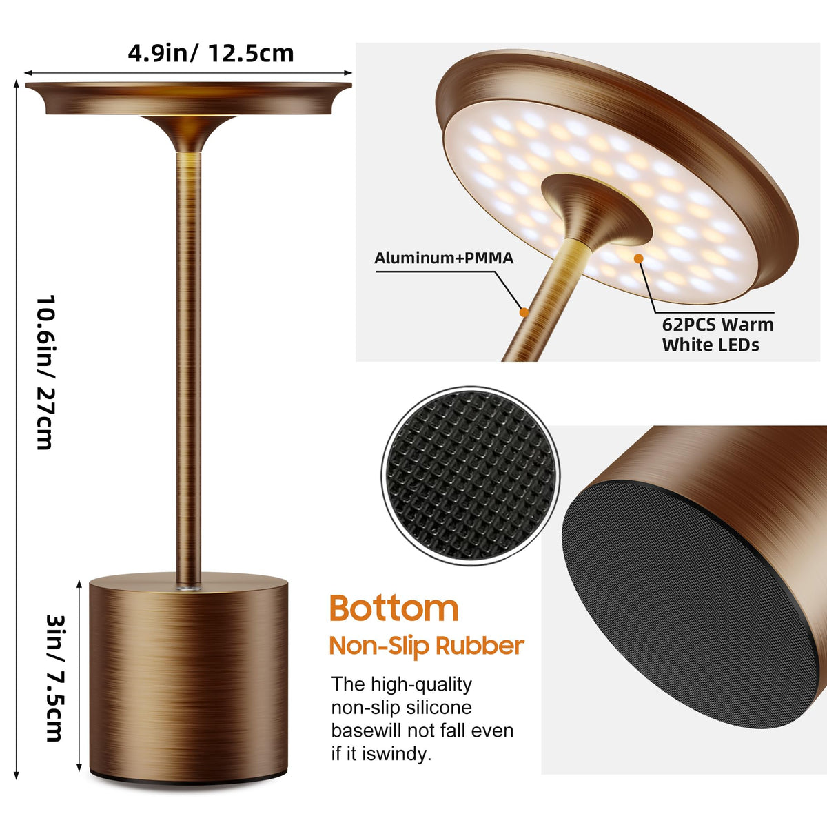 Cordless Table Lamp, Portable Rechargeable 6000mAh Outdoor Table Lamp, 3 Color Stepless Dimming Battery Powered Lamp, LED Table Light for Dinner/Bedroom/Restaurant/Outdoor Illuminate your space with elegance and functionality using this Rechargeable Cordless Table Lamp. Designed for versatility, it combines a sleek metal exterior with advanced lighting features to elevate your environment-whether indoors or outdoors. With its 5000mAh high-capacity battery, enjoy up to 24 hours of wire-free lighting on a single charge, making it ideal for bedrooms, dining tables, patios, and even outdoor events. This modern LED desk lamp offers 3-color stepless dimming, letting you seamlessly switch between warm white, natural white, and cool white to match any mood or occasion. Its IP54 waterproof rating ensures durability against splashes and dust, making it perfect for gardens, terraces, or camping trips. Combining portability with premium craftsmanship, the lamp? compact and lightweight design ensures easy transportation while its aluminum alloy finish complements any decor. Whether you?e setting the ambiance for a romantic dinner, reading in bed, or hosting guests outdoors, this cordless rechargeable lamp delivers the perfect balance of style, convenience, and performance.
