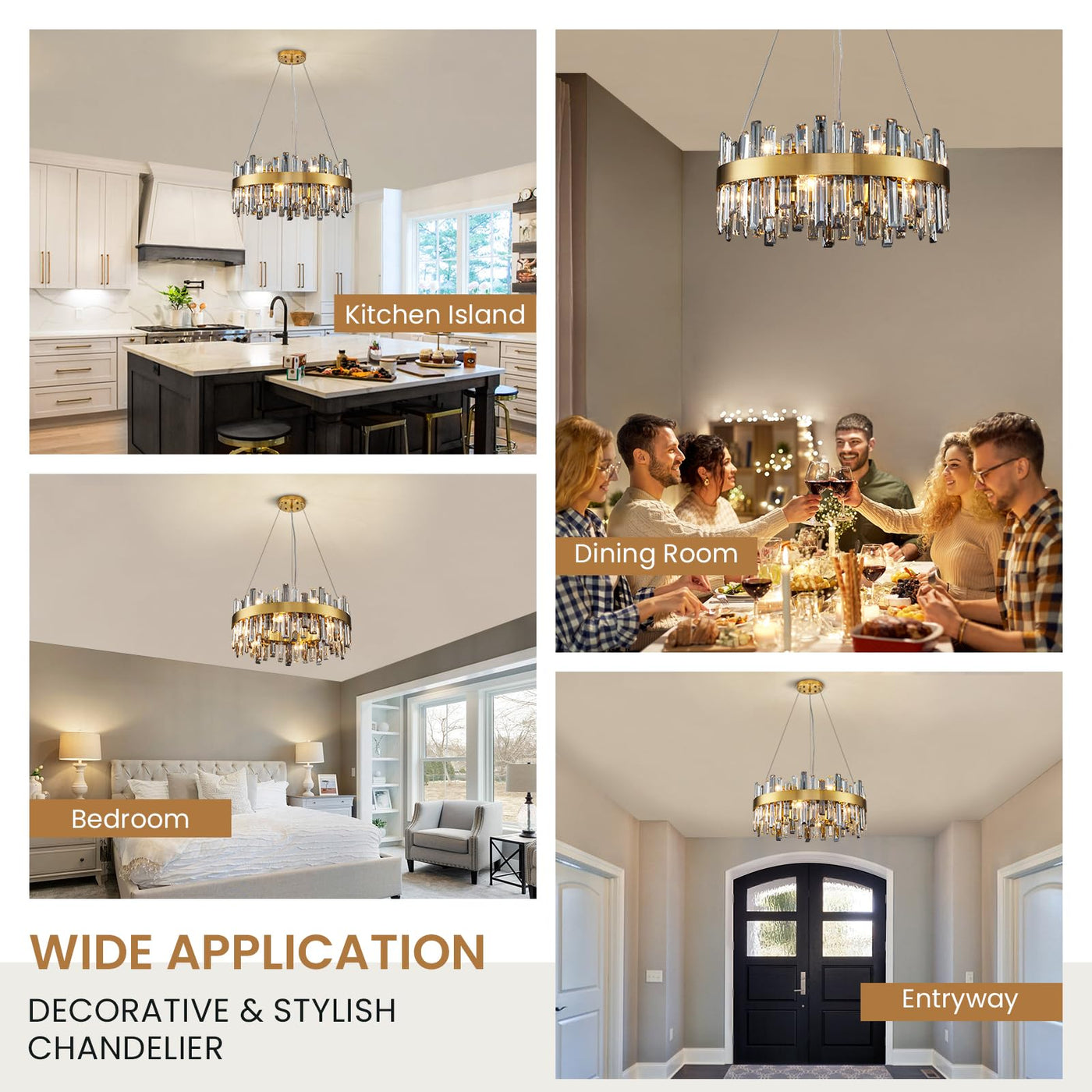 Description: Elevate your home decor with the luxurious Siljoy Gold Crystal Chandelier, a perfect blend of modern elegance and functionality. Designed to create a warm and inviting atmosphere, this contemporary chandelier is an ideal centerpiece for various spaces, from dining rooms to entryways.