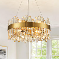 Transform your living space with the Siljoy Modern Chandelier, a stunning blend of elegance and functionality designed to enhance any room's atmosphere. Crafted with a luxurious brass gold frame and exquisite clear K9 crystal strands, this chandelier is perfect for dining rooms, living rooms, kitchens, and more.