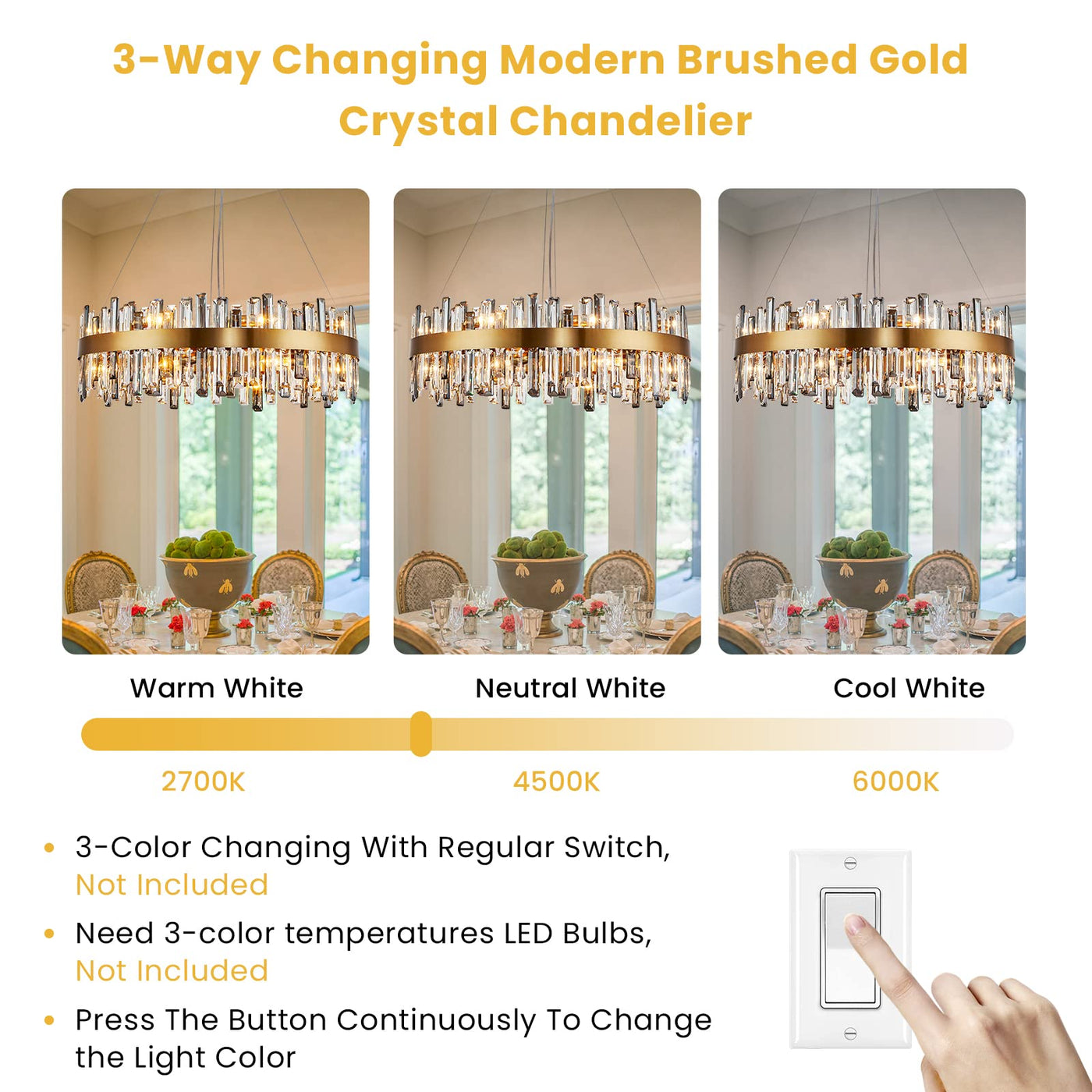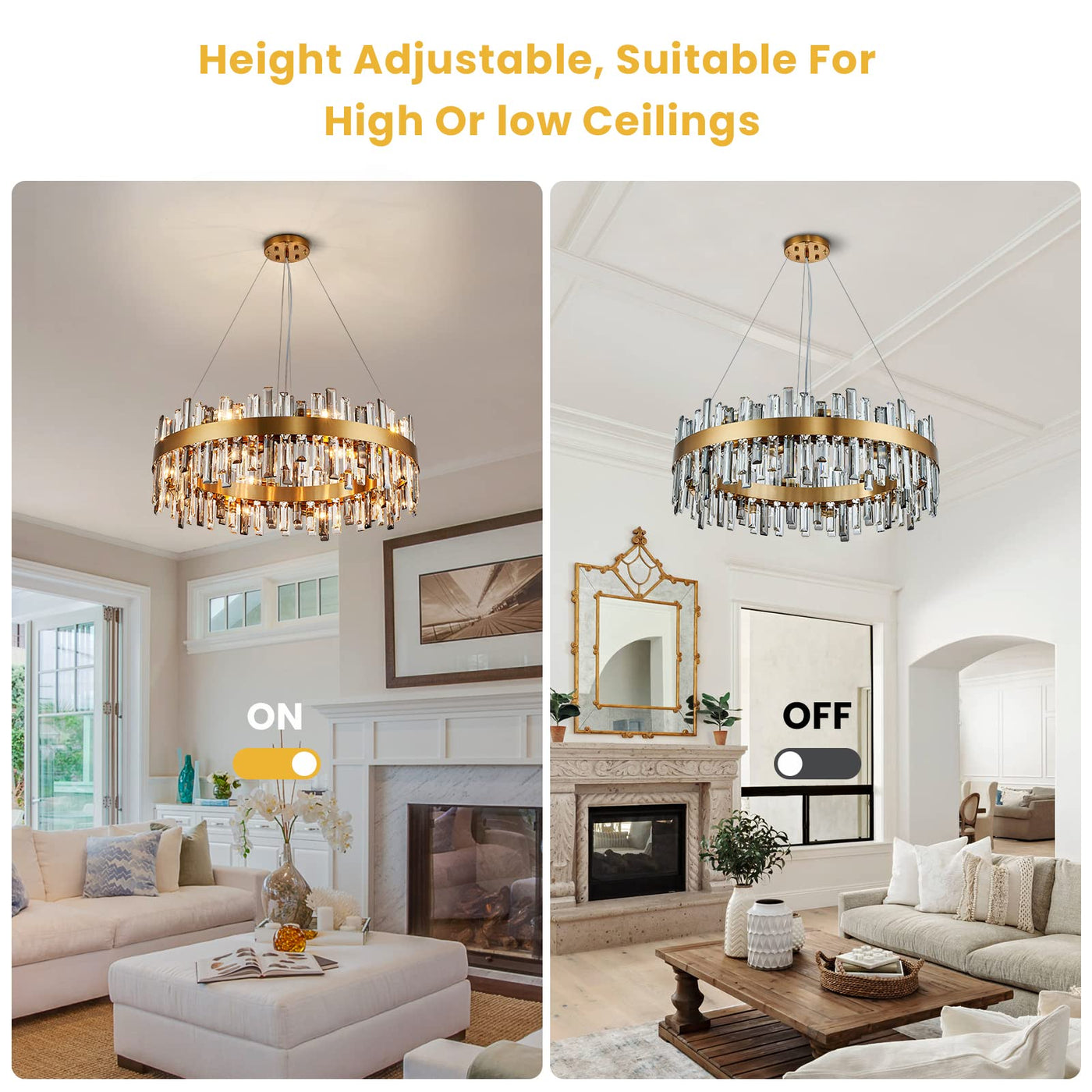 - ? **Large Brass Gold Chandelier**: This modern crystal chandelier features an elegant raindrop lampshade made from clear K9 crystal strands, adding a luxurious ambiance to any space, making it perfect for dining rooms, living rooms, kitchens, foyers, entryways, offices, and hotels.