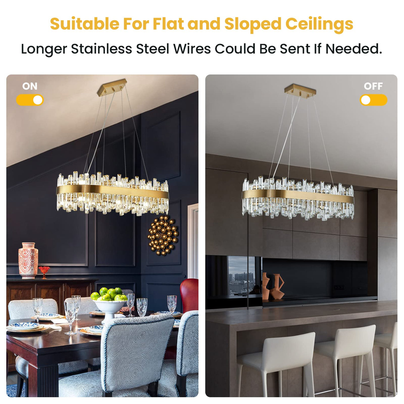 Q: Can this chandelier be installed in different types of ceilings?A: Yes, the Siljoy Modern Crystal Chandelier is designed for versatility and can be installed on flat, sloped, and vaulted ceilings. Longer wires for higher ceilings can also be provided upon request.